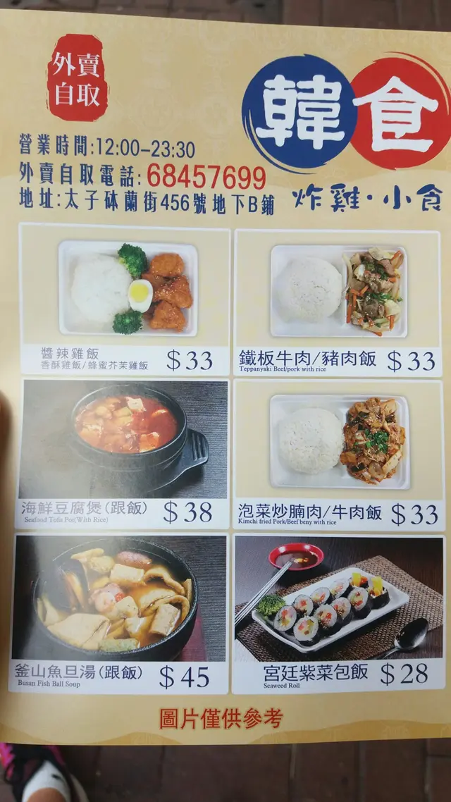 韓食 (太子) 网址: https://s.openrice.com/QrLS0q88700 地址: 香港太子砵蘭街456號地下B舖 电话: +852 68457699