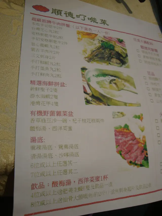 尋日(3-4-2013 Wed)爸爸為今日清明節鄉下祭祖,所以返o左鄉下.我就同男友出街食晚飯,由於男友o係旺角,我就叫佢諗食咩o野?佢o黎到呢座大廈,問一係食日本燒放題,如果怕熱氣就o黎我o地同男友人LKH,佢太太同女友人DC食過o既呢間(o個次食評: http://www.openrice.com/restaurant/commentdetail.htm?commentid=2159047,原來o岩o岩係2年前),食粥底火鍋,咁好啦,o黎呢間啦.我放o左工即刻搭車出o黎,男友先o黎坐低等我,o黎到,佢坐o左角落o既一張四一枱,我坐低後就剔o野食喇.當然要$48.00o既順德粥底火鍋.其實粥底好稀,不過都食到有米味.鮮料要o左:1. $58.00o既咸豬骨有o左冇味白粥,梗係要揀o野做湯底,男友o係同樣要$58.00o既半隻鮮雞件同呢樣中揀,就揀o左呢個.呢個一o黎到,高級啲o既男人好快手幫我o地加o左落個鍋o度,我唯有叫男友撈返上o黎影.而因為佢o既主要作用係令啲粥有味,所以我o地都係最後至食.我就食o左兩舊,一舊超多肉,一舊主要係骨膠原多,餚完後都重幾鹹,但啲肉都唔係好o鞋,又係唔錯.我食o左兩舊後,見個鍋都好似重有三,四舊,如果爸爸一齊o黎,佢應該會食晒.2. $28.00o既響鈴卷其實到o衣o家都唔知點解呢樣o野叫做響鈴,呢個放o左入去好快就吸水,攪到我食唔到外腍內脆o既感覺,開頭以為我放得太耐,但我試過真係夾住放入去未浸過面即刻夾上o黎食,開頭食都食到脆,但未食到半條就已經唔脆,因為啲湯係咁浸落去.所以畀我揀,我會揀同價錢o既炸魚皮,起碼佢夾o左上o黎後,唔會咁快索啲湯.8. $68.00o既珊瑚蚌o衣o家睇返menu同相至醒覺咁貴,呢個新解爽口,OK o既.3. $48.00o既黃鱔片從未試過用黃鱔打邊爐,呢個灼熟後好鯹,男友食o左兩舊頂唔順唔食,其他o既由我o黎食,不過我我都係留到最尾食.7. $22.00o既娃娃菜太多肉,點都要整個菜o黎食o既,男友話呢個啦.呢個都正常冇乜問題啦.4. $48.00o既手打墨魚丸一碟得8粒,貴得驚人喎,而且味道同口感都一般,都唔彈牙.5. $28.00o既金菇菜點解啲菇咁大粒o既?呢個正常啦,不過如相中睇到,有啲唔乾淨.6. $38.00o既新鮮滑牛肉呢個最後至到,唔係男友問我我都唔記得有剔.呢個紅當當o既,灼完牛肉o既味道都落晒o係啲粥o度,不過灼耐o左都唔係好o鞋.9. 最後係送o既綠豆糖水我未食時嗅到好香臭草味,而且睇8月男友,見佢勺到好多綠豆,我問有好多綠豆喎.佢就話好似食臭丸.