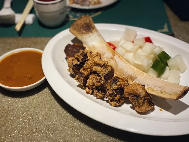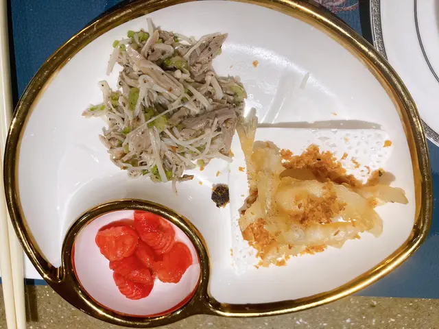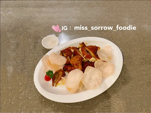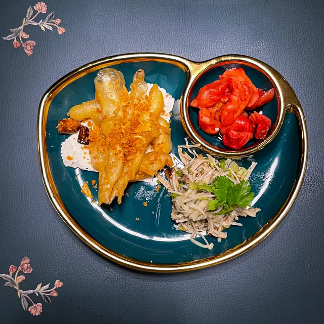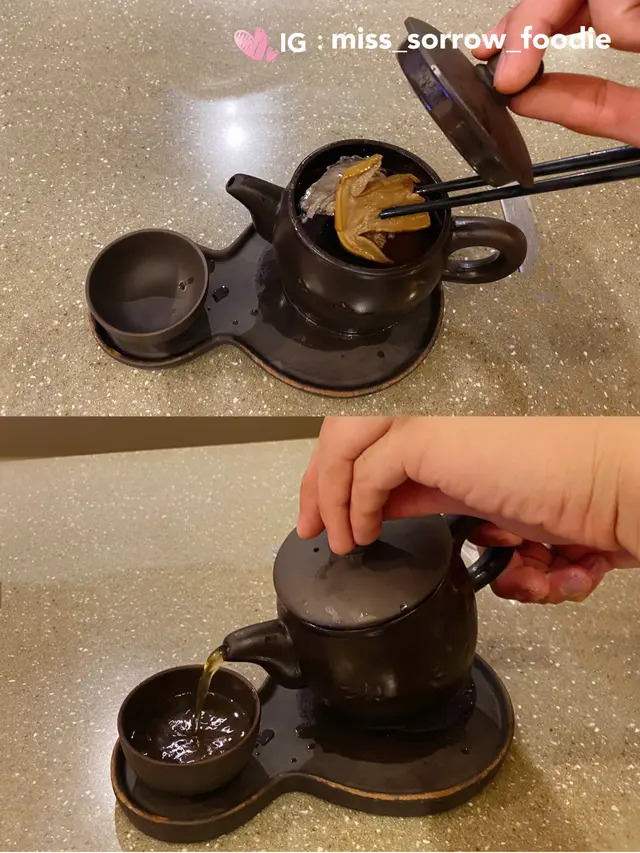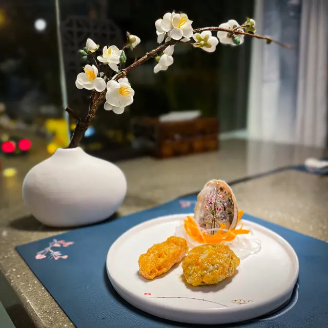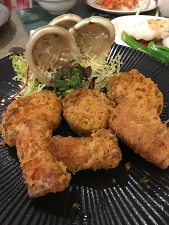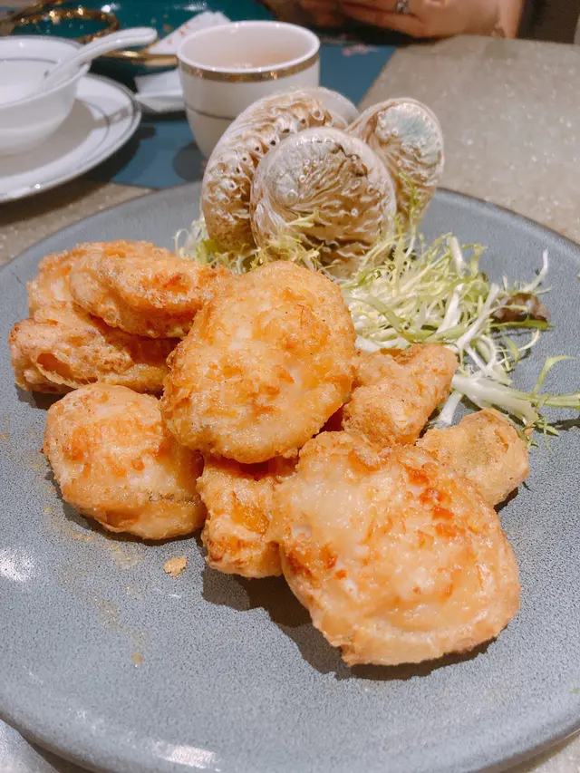 呢間餐廳以當季食材為主,保留傳統粵菜烹飪方法,製作各式精品點心同中菜🥢💗松露金菇伴火鴨絲 ($68)涼拌金菇加入火鴨絲、芹菜、黑松露醬,味道清爽開胃,松露香突出🥙💗黃金南非鮑魚($136/2隻)南非鮑魚大隻肉厚,鮮嫩腍滑🐚連同蕃薯粒炸脆後,以金沙醬炒香,但鹹蛋黃味未夠濃郁甘香🥚💗百花炸釀蟹鉗 ($48/隻)釀蟹鉗炸得金黃酥香,蝦膠爽彈結實,配以糖醋汁中和油膩感。不過𥚃面並無任何蟹肉,比較失望🦀💗牛肝菌螺頭燉烏鷄茶壺 ($78/壺)以原裝茶壺燉湯,確夠原汁原味,保持熱度。湯料包括牛肝菌、螺頭、瘦肉、烏雞等,非常足料,有滋補養生功效🍲💗脆皮龍崗炸子雞 ($168/半隻)炸子雞雞皮金黃香脆,雞肉嫩滑Juicy,雞鮮味濃,再蘸上淮鹽一齊食🐓💗香酥牛肋肉 ($218)牛肋肉先經慢煮,沾上炸漿後炸至酥脆。牛肋肉外脆內軟,筋腱位有嚼勁,肉味香濃且帶適量油花🐃配以自製咖理汁,微辣惹味🥘💗香蒜海蝦飯 ($98)蔥花蛋炒飯乾爽且飯粒分明,鑊氣十足,蒜香濃郁惹味🧄以熱鍋上枱除咗保持熱辣辣之外,底下仲會結成飯焦。面頭有頗多海蝦,不過蝦肉較「霉」唔夠新鮮🦐查看更多