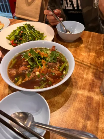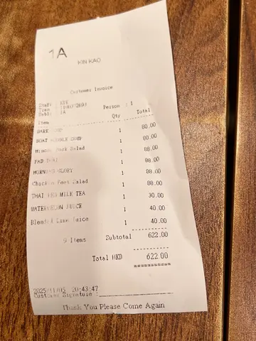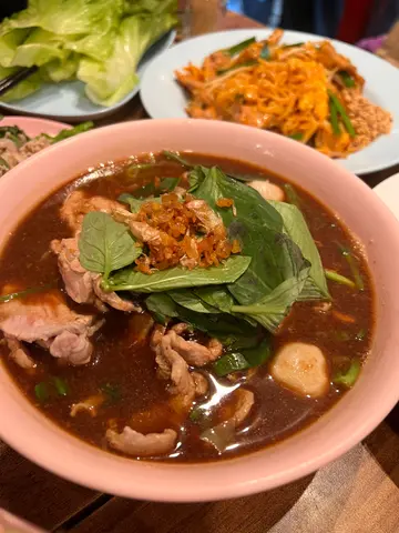 (收据喺最后)依份泰国菜菜单光看就让人食指大动!每一道都色香味俱全诱惑🏆 一软一爽的极致对比• 秘制猪手檬粉:猪手炖到宛如琥珀,颤巍巍胶质喺快子尖轻晃,入口瞬间化作缠绵胭脂鹅脯香。檬粉如丝绸般滑过喉咙,酸辣汤底彷佛在舌尖跳起踢踏舞,忍不住闭眼叹息。• 酸辣凤爪沙律:水晶凤爪脆得咔嚓作响,柠檬汁同鱼露交织成烟花爆破酸辣风暴,紫洋葱如点点繁星在味蕾炸开,这道菜简直是口腔的清醒梦!🔥 街头灵魂在盘中复活• 黄金鸡肉炒金边粉:镬气如烈焰般包裹每根粉条,嫩滑鸡肉与焦香蛋丝喺泰式甜辣酱中缠绵,挤上青柠的瞬间——酸甜咸鲜如交响乐轰然奏响!• 狂野生菜包:炒香肉末带著薄荷与香茅的清新暴击,用冰镇生菜包裹送入口中,冷热交织的触感彷佛曼谷夜市喺口中重现!🌿 清爽与浓烈完美平衡• 牛肉鸡蛋面:半熟蛋黄如夕阳流淌进浓郁汤底,嫩牛肉片与弹牙面条在椰浆香气中共舞,每啖都温柔泰式拥抱。• 虾酱炒通菜:通菜脆嫩得能听见田野絮语,虾酱咸鲜海潮扑嚟,似「东方青龙」喺餐桌上掀起翡翠风暴!这桌菜简直是场舌尖上的泼水节——酸辣鲜香如五彩水花四处迸溅!从胶质满满的猪手到清爽透心的凤爪,从镬气冲天的炒粉到温润治愈的汤面,每道菜都在味蕾上跳著传统与创新交织的泰式舞蹈。最后那筷虾酱通菜更是画龙点睛,让这场飨宴在海洋的鲜香与田野的清新中完美收官,现在回想还忍不住唾液奔流!…查看更多