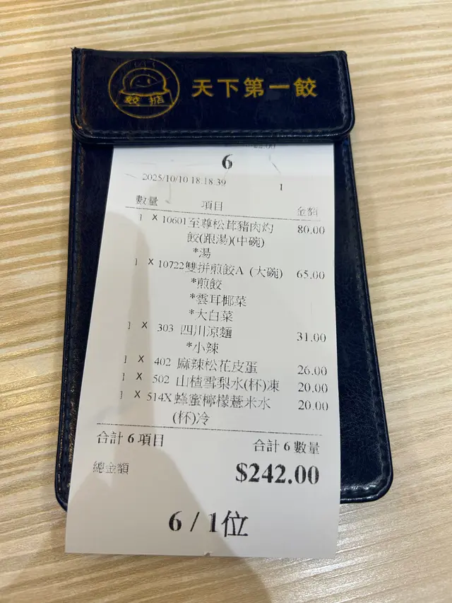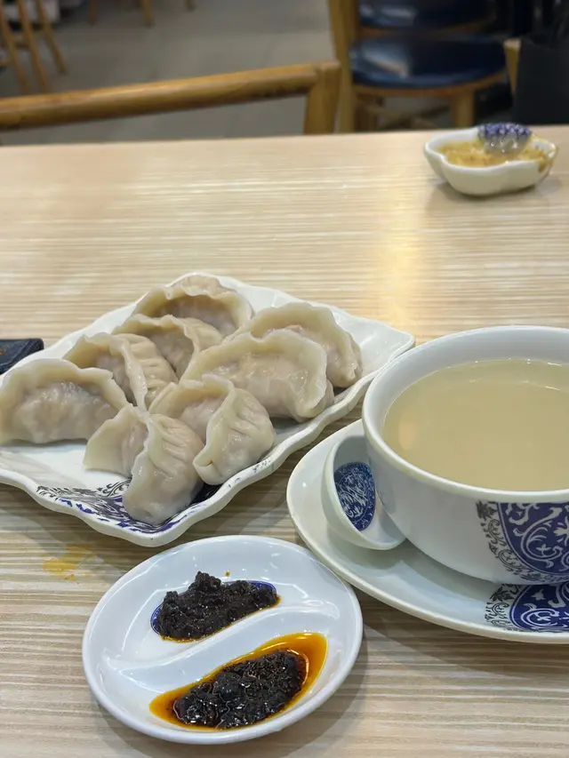 呢间饺子🥟店向来出名,尤其系自家制嘅靓汤!一定要配饺子🥟先好食黄金原味皮蛋 蛋黄系溏心蛋,咬落去好软滑,带微微的甜味,亦唔会任何苦涩味!龙凤松茸双汤饺(状元九鼎汤)分别系黑松露+白松露饺子🥟个人比较中意黑松露饺子,因为松露香味非常浓郁香喷喷,再配一啖自家制妈妈👩汤,更有提鲜作用!大白菜猪肉饺、云耳椰菜猪肉饺除左食本店招牌药龙凤饺之余,仲可以点其他饺子🥟试吓!大白菜🥬猪肉清甜健康,配一口自家制靓汤,尤其舒服云耳椰菜猪肉饺子,云耳+椰菜好爽脆,云耳椰菜猪肉饺上汤松茸时蔬菜心翠绿新鲜,配上松茸粒,吃下去觉得成个人都好健康!自家制山楂雪梨水浓郁的山楂水,喝下去清甜之余,在夏天喝一口尤其解渴!蜂蜜柠檬薏米水酸酸甜甜,有解腻作用,而薏米更有健脾和利水渗湿作用~…查看更多