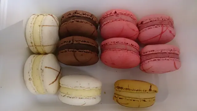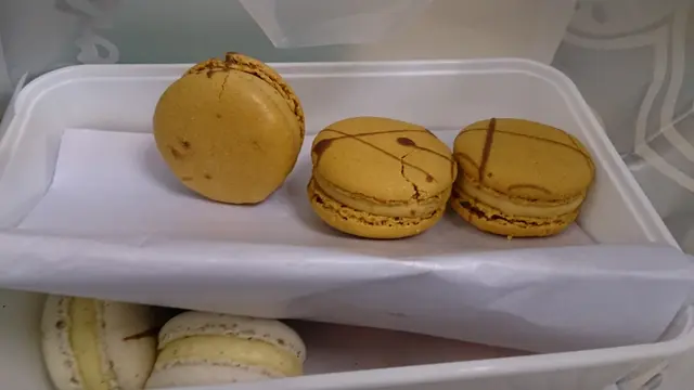 Walked by the Hospital coffee shop and found a new item from the pastry chef. Macarons! What?!!?There were five flavors. Salty caramel, vanilla, chocolate, strawberry and raspberry. All for $10 each. I got ten.Texture was nice and dry. Macaron was crispy though not much almond flavor. Ganache filling was smooth but tasted like butter. Raspberry, strawberry and vanilla flavors were nice. Strawberry even had bits of fruit inside. Chocolate was very rich. Salty caramel wasn't very good as there wasn't enough salt to bring out the caramel flavor.Packaging could be improved as they just put it in a plastic container that broke some of the macarons when I got them home.Not great macarons but for $10, not bad.…查看更多