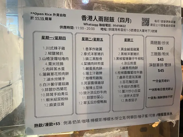 香港人兩餸飯 (希雲街) (铜锣湾) 网址: https://s.openrice.com/QrLS0rKKC00 地址: 香港銅鑼灣希雲街1-5號禮信大廈地下3號舖 电话: +852 57703778