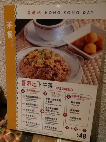 Maxim's is an interesting company. Sometimes they are pretty good. And sometimes, it's beyond horrifying. And then there are times you get both in one setting.Boyfriend and I arrived in Tsuen Wan and I was SUPER hungry. So we just randomly ate at the nearest place and that was Hong Kong Day. A cha chan teng concept from Maxim's.During afternoon tea time, they have various afternoon tea sets. Menu is in English and Chinese. There is no 10% service charge. You order at the table and pay on your way out. But one has a set where you can choose three items (a snack, main and dessert or drink) and it only costs $48. There are lots to select from and we decided to order from that.This is what boyfriend ordered. The snack was a seaweed soup with three different types of fish balls. The balls were ok. Nothing special about them. The soup was savory but had a hint of MSG.The main was a stir fried beef rice noodle. This was pretty delicious and a good generous portion. It wasn't overly oily and the beef was tender without the taste of meat softner.The dessert he chose was a coffee cake. This was actually a multi-layer coffee jelly and REALLY good. The taste of coffee was strong and rich. The jelly had a nice bounce.I chose the fried chicken wing and fries as a snack. I say wing because it may look like two wings from the photo, it's actually one wing but they separated into two. The wings were good. Super crunchy and tasted like the McDonald's fried wings but 10 times more spicy. The fries were good, too.My main was a spaghetti bolognese with a fried egg. Here is an example when Maxim offers something abhorrent. The bolognese sauce was really good. But the fried egg? Was still a bit on the raw side. The egg white was still clear. And the pasta? It wasn't drained properly and was still watery underneath.My dessert was jelly. And it was exactly that. A big cup of lime jelly with canned pineapple. I'm a happy camper over this as I love Jello. It fit what I wanted. I won't complain.Maxim's. Always unpredictable. Sometimes good. Sometimes bad. But at least not expensive.…查看更多