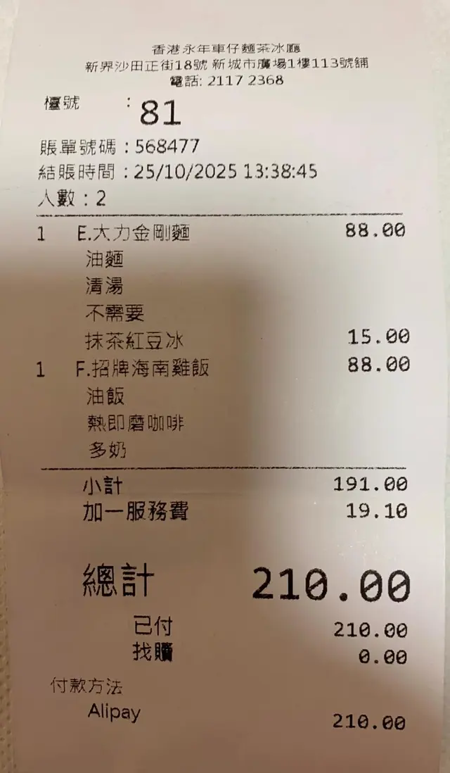 香港永年車仔麵茶冰廳 (沙田) 网址: https://s.openrice.com/QrLS0HzE4W0 地址: 香港沙田沙田正街18-19號新城市廣場一期1樓113號舖 电话: +852 21172368