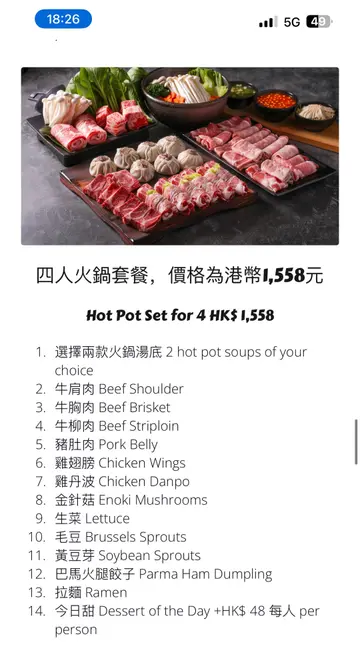 位于兰桂坊嘅香港火锅提供跨越亚洲嘅美食体验,搭配多款火锅汤底同新鲜本地食材,加上原樽地道酱料,新派嘅格局非常适合带外国朋友嚟试吓!除咗今次试嘅二人餐,仲有一人同四人餐;汤底拣咗黄毛鸡汤同味噌汤,配搭任何食材都very okay。♙ 两人火锅套餐 $778𖦹 两款火锅汤底:香港黄鸡汤 & 日本味噌汤𖦹 日本A5和牛腰肉片 𖦹 南非和牛肋眼𖦹 伊比利亚猪排骨 𖦹 猪肚肉 𖦹 猪肉丸𖦹 黄毛鸡翼 𖦹 黄毛鸡丹波𖦹 时令蔬菜 𖦹 炸豆腐𖦹 水饺 𖦹 面条