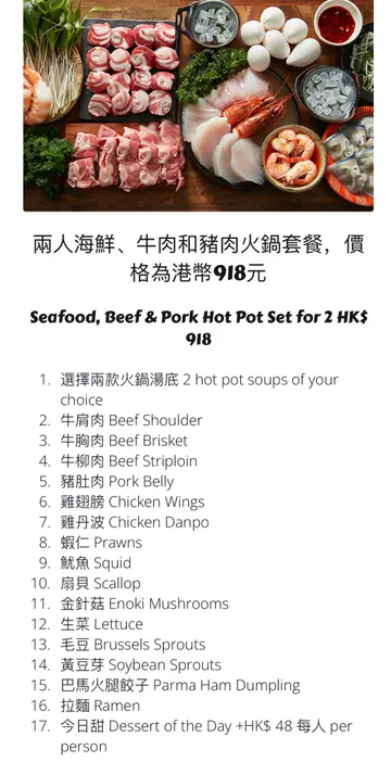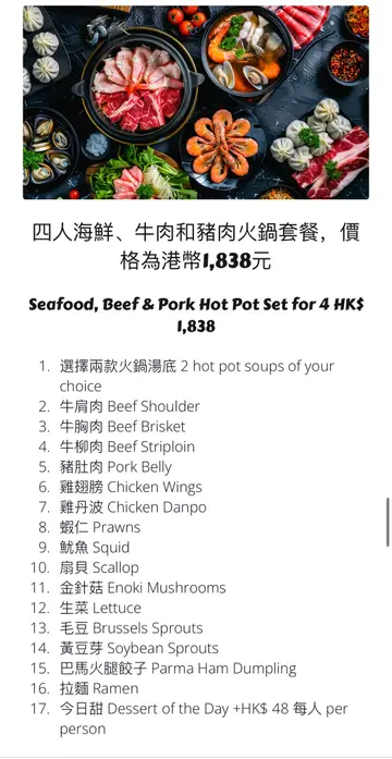 有冇人同我一样间唔中就会有铺「边炉瘾」🤣最近试咗呢间喺中环lkf嘅火锅,装修有格调得嚟环境舒适,墙上仲有描绘香港景色嘅壁画添🏙️我哋试咗2人海鲜牛肉和猪肉火锅套餐 ($918),有成16种食物咁多,牛猪鸡海鲜蔬菜同面食咩都有😍 除咗牛系用上日本同南非和牛之外,其他全部都系本地食材!仲有连调味料都系用上香港老字号,真系名符其实嘅香港火锅🇭🇰汤底我哋拣咗双拼:香港特色黄毛鸡汤同素食番茄汤😋 前者用上本地黄鸡熬制8-10小时,冇落味精,饮落劲清甜🐓番茄汤入面有好多番茄粒,饮到番茄嘅天然酸甜味道,好清新🍅咁多样嘢食入面我最钟意日本A5和牛腰肉片同南非和牛肋眼,2款肉质都细嫩食落有奶香🐮 韭菜猪肉手工饺皮薄馅多🥟🦐🦑🐚海鲜虾、鱿鱼同 北海道扇贝都好新鲜!🥬仲有有好多蔬菜,食完好似冇咁有罪恶感🤣整体嚟讲食材质素好高质,而且环境好舒适,最欣赏嘅系佢哋坚持用上最新鲜嘅本地食材,配搭唔同亚洲风味嘅汤底👍🏻 因为座位有限所以有兴趣记住book位啦~
