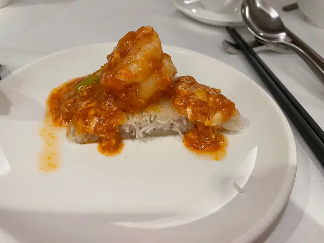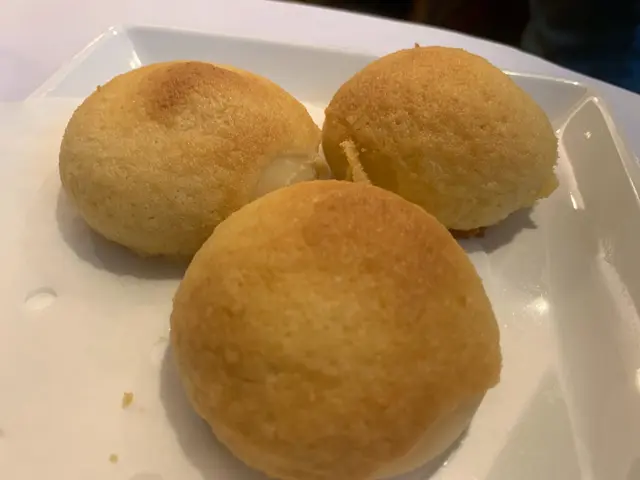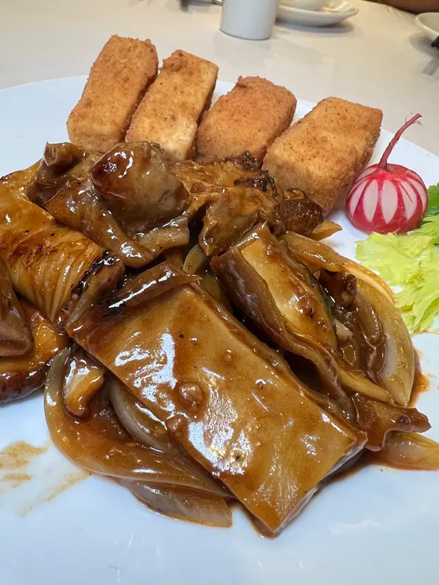 預先寫菜每位$68O元全包,中秋做節在此,整體水準唔錯,六個人都有私人房間。頭盤四小碟醉鮑魚黑醋脆鱔五香鴨舌椒鹽龍躉魚皮椒鹽龍躉魚皮最有驚喜,四十斤龍躉的厚皮,外脆內黏調軟滑,口感豐富,骨膠原滿嘴。奄仔蟹蒸肉餅奄仔蟹正值時令,金黃蟹膏脂香幼滑,肉餅吸盡精華,我們即點白飯,完美配搭。芥蘭炒本地肥牛肉食唔出是肥牛,但鬆軟入味,中規中矩。家鄉鹽水鵝做得唔錯,適當鹽香,切至細細件,清而味足,不過吃過肉質更滑的鹽水鴨,而且鵝太大隻,六個人來說就過多了!青提子咕嚕本地黑毛豬肉青提子暖暖地,多汁無酸味,竟然與咕嚕肉合拍;黑毛豬半肥瘦,肉質有彈性,幾好食。蒜茸炒西洋菜救鑊氣,炒得香,蒜茸粒份量多不霸氣。薑葱雞絲燜拉麵拉麵非常有韌力,喜出望外,是整個麵的靈魂,我們個個都讚,味道亦好,可惜,雞絲始終有點嚡。紅豆沙湯圓.特色甜點迷你月餅、椰汁糕與紅豆沙湯圓,如沙粒的紅豆沙,唔太甜,好好味。 #香港華商銀行公會 #中環 #中環美食 #粵菜 #中菜…查看更多