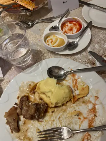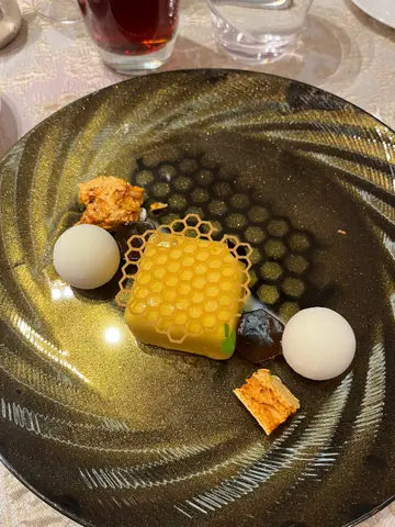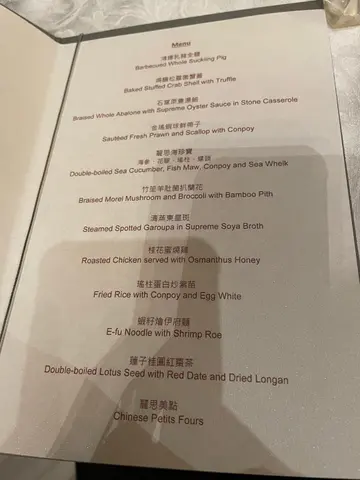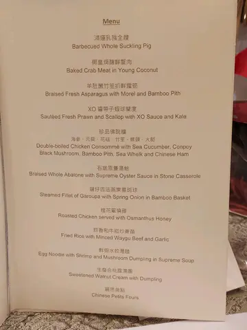 第一次在这里饮宴, 钻石厅极尽豪华 ,巨型的水晶灯 ,几层高的楼底, 华丽的舞台 ,令人眼前一亮。 当然还有高水准的酒席 ,每一道菜都精心设计, 营养均衡,色香味俱全。 服务当然是一流的 ,餐前各种饮品不断供应 ,红酒白酒橙汁汽水茶 ,应有尽有。 可惜的是每上一道菜, 都见不到全貌 ,因为侍应会在旁边的枱上分配好12份 ,送到宾客面前 ,少了欣赏菜式的机会, 美中不足。💥💥鸿运乳猪全体, 皮脆肉嫩 ,可惜有少少猪寒味。👍👍💥💥椰皇焗酿鲜蟹肉,超好味, 好多蟹肉一梳梳 ,加上椰香味, 超和谐的组合。👍👍👍👍👍💥💥羊肚菌竹笙扒鲜露笋, 新鲜珍贵的食材, 用上汤灼熟, 绿油油地上碟 尽显山珍美味。👍👍👍👍👍💥💥xo酱 带子虾球兰度, 新鲜爽滑的带子和虾球 ,用xo酱爆炒 ,配上芥兰, 样靓味鲜甜。👍👍👍👍👍💥💥珍品佛跳墙 ,用海参, 元贝 ,螺头,花菇, 火腿, 竹笙 ,在鸡汤中炖制, 清润甘甜, 美味无比。👍👍👍👍👍💥💥石锅原只汤鲍, 用蚝油炆得软滑 香糯的干鲍, 配两棵绿油油的小棠菜 ,在翻滚的石锅中呈现最高姿态。👍👍👍👍👍💥💥龙仔古法蒸东星斑球 ,一大块新鲜的东星斑球, 用姜葱蒸熟, 呈现粉红色 ,食落爽口鲜甜 ,海鲜中的极品。👍👍👍👍👍💥💥桂花蜜烧鸡 , 普通烧鸡一只, 不觉有桂花香味 ,旁边𠮶啲配菜特别, 有炸芋头炸紫薯。👍💥💥蒜香和牛松炒香苗 , 非常出色的炒饭, 用和牛 ,蒜, 蛋 组合,每一粒米 都香鲜美味, 香苗原来是指气味芳香的丝苗米。👍👍👍👍👍💥💥鲜虾水饺汤面 , 比较普通的一味, 同街上的水饺面冇乜分别。💥💥生磨合桃露汤圆 , 非常成功的甜品, 生磨的合桃露 ,又香又滑 ,加两粒汤圆 ,团圆美满的感觉。👍👍👍👍👍💥💥丽思美点, 一块桂花糕 , 一块合桃酥, 太敷衍了, 配不上丽思这个美名。版面限制 ,不能出齐所有食物的相片。整个宴席吃得非常开心 ,满足, 服务是超水准,好少有人食剩食物,可见宾客对食物是非常满意的。 我觉得如果在分发食物前, 先将菜式 亮一亮相就更加好啦,让尊贵嘅宾客, 可以欣赏厨师的杰作。 😘😘
