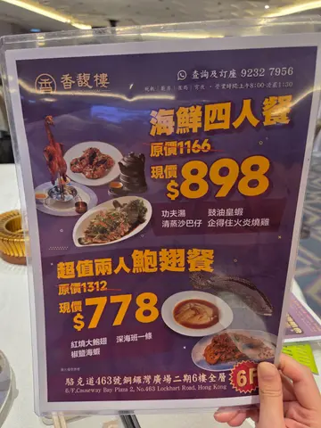 晚上来到铜锣湾和家人吃晚饭, 找到了这家非常有心思的粤菜酒楼, 环境非常宽敞舒适, 走中高档的粤菜中菜馆路线, 无论食物质素和服务态度, 都非常不错。<香煎莲藕饼>莲藕饼用料十足, 猪肉份量好多, 每一啖都吃到爽脆的莲藕, 而且外皮煎得酥脆, 肉质实在。<青瓜海蜇头>青瓜清甜, 海蜇头入口爽脆, 伴以酱油、麻油、蒜泥等作调味, 清爽美味。<子姜皮蛋冻>外形就像啫喱一样, 晶莹通透, 混合着皮蛋与酸姜, 入口又滑又爽, 味道酸甜适中, 配上溏心皮蛋, 感觉非常特别。<黑鱼子烟熏流心蛋>烟熏过的溏心蛋, 蛋味香浓, 入口又滑又软。<紫砂茶壶功夫炖汤>餐厅以紫砂茶壶盛满鸡肉、猪肉、响螺、海底椰等材料, 来煮这个炖汤, 炖汤味道非常清甜, 汤色清澈, 入口每一啖都是精华, 而且味道浓郁,感觉清润滋补。<金钩蒜蓉蒸胜瓜>胜瓜面铺上大量炒香的蒜蓉和虾干一起来蒸, 配以酱油来调味, 虾干的鲜味非常突出, 而且胜瓜入口清甜多汁, 非常好食。<秘制脆皮烧鹅>烧鹅非常多肉, 外皮烤得微脆松化, 而且鹅皮好簿, 肉质鲜嫩多汁, 不会过于肥腻, 个人觉得系必食之选!!~餐厅除了有二人餐, 还有不少不同的优惠套餐, 二人至十二人都有, 而且中午时段又有点心特价优惠, 非常抵食, 值得再去。…查看更多