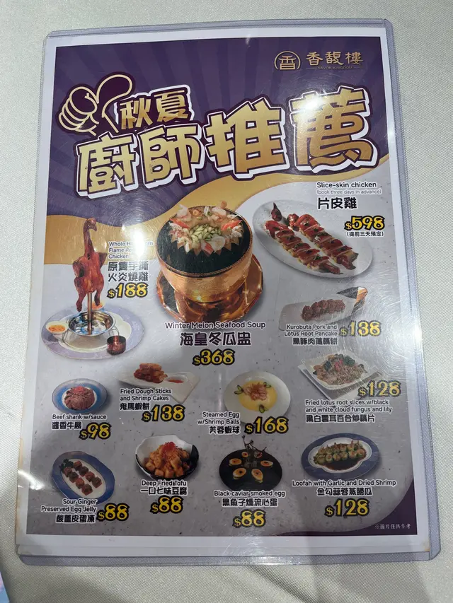 🔶🔷🔶呢隻脆皮燒鵝 一定唔會令你失望🔷🔶🔷⬇️睇內文食評同地址啦⬇️。‼️Follow me @pig_g_pig 睇多d食玩買資訊‼️👍🏻 有你地嘅Like & Share 係我繼續出Post嘅動力。通常市道麻麻,d食肆就會推出優惠套餐,作為消費者,梗係把握呢個機會用低價周圍食好嘢。位於銅鑼灣廣場二期嘅呢間酒樓,間唔中有老牌歌手駐場唱經典金曲,叔叔嬸嬸食嚇圍菜,聽嚇歌,都幾爽。我當晚去就無歌聽,我主要目的係試佢個夏日二人餐($500)。紫砂功夫燉湯先嚟一人一壺燉湯,下面有小蠟燭保持溫度,要飲嘅時候先斟出嚟用紫砂茶杯飲,包保一定keep到溫度,燉湯好足料,打開有雪梨、螺頭、瘦肉、雞肉,飲落去好舒服。香煎蓮藕餅、青瓜海蜇頭、子薑皮蛋凍、黑魚子煙燻流心蛋四款開胃小菜最特別係子薑皮蛋凍,平時呢兩樣嘢會分開食,但呢個組合永遠都會一齊上,今次直頭將佢哋擺埋一齊,一啖就食到曬兩款嘢。金鈎蒜蓉蒸勝瓜呢味菜清清地之餘,每一嚿勝瓜都有一隻蝦米吊下味,清得嚟又唔會太悶。香馥秘製脆皮燒鵝重點就係呢隻燒鵝,皮薄又脆,無多餘肥膏,燒鵝肉質鬆化,$500套餐包成半隻燒鵝,真係十分抵食。📍香馥樓 (銅鑼灣)銅鑼灣駱克道463-483號銅鑼灣廣場二期6樓…查看更多