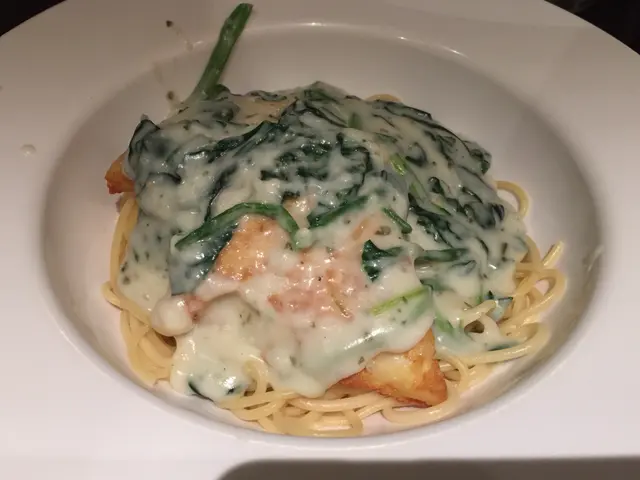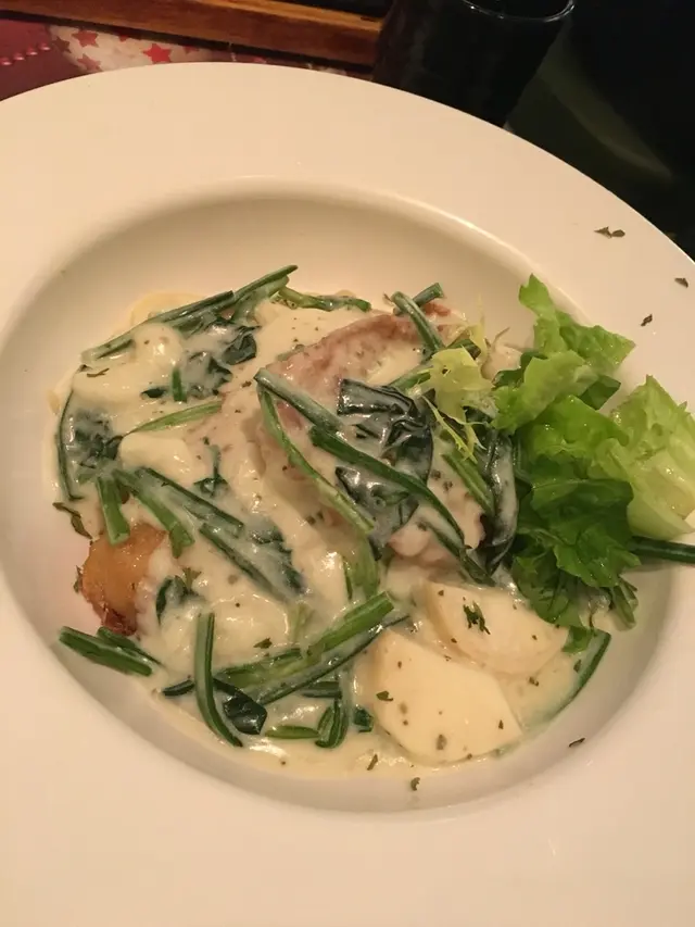 我們叫咗菠菜忌廉汁龍脷柳意粉、蜜燒德國鹹豬手配薯菜同鐵板西冷牛扒配薯菜!菠菜忌廉汁龍脷柳意粉嘅龍脷柳表面煎得都幾金黃,