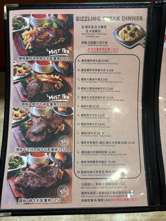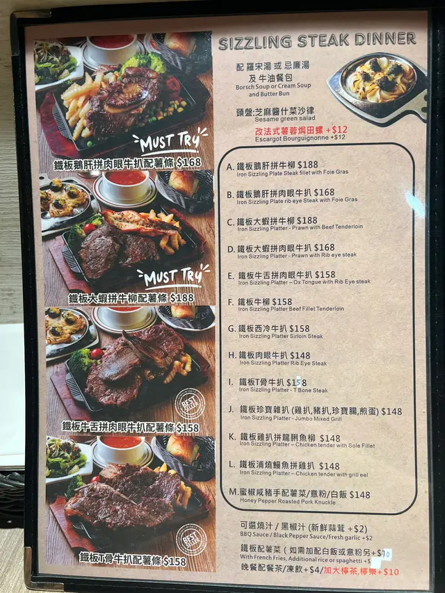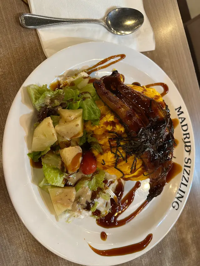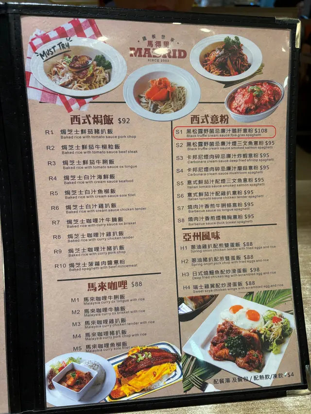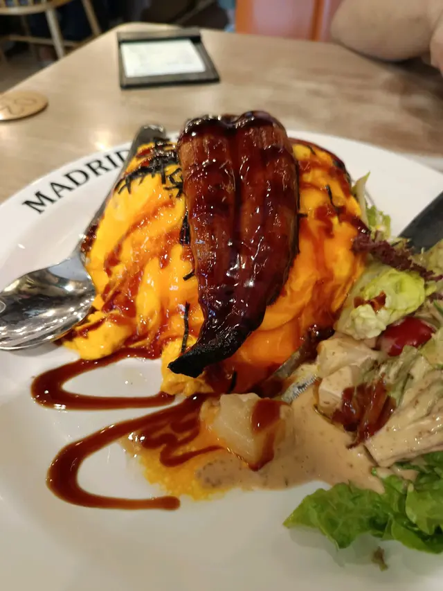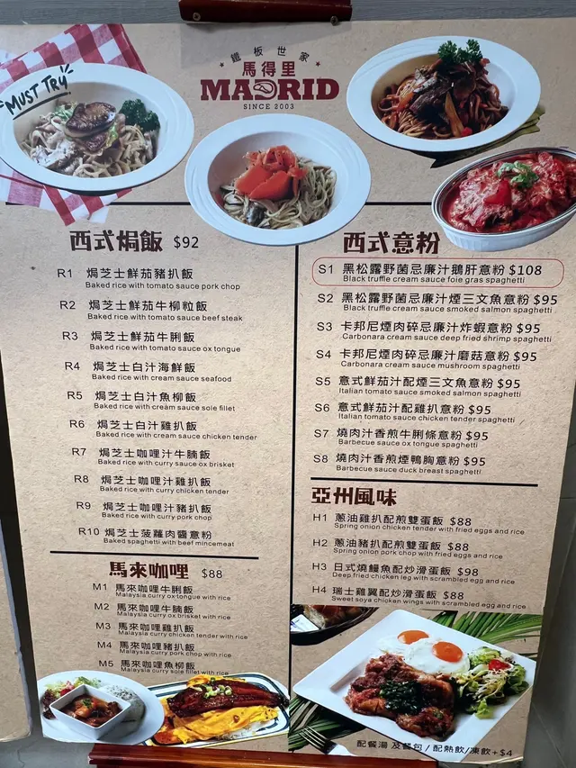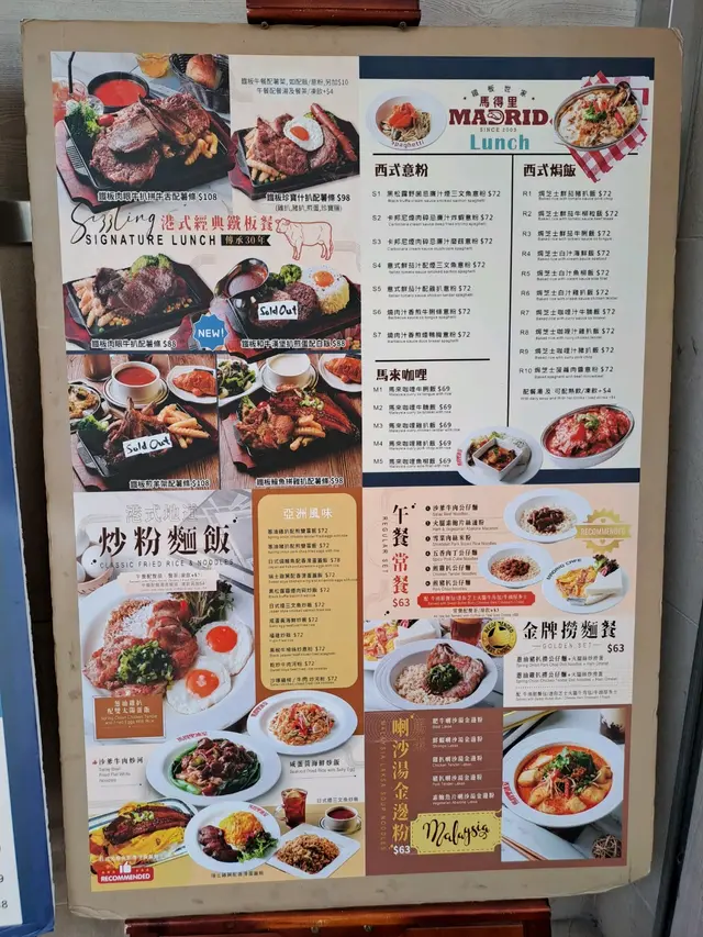 ## 食評:深水埗 Madrid Cafe今日放工之後,我自己獨自去咗深水埗行街,無意中入咗一間主打鐵板餐的茶餐廳,Madrid Cafe。餐廳裝修簡單舒適,以懷舊為主,適合一個人靜靜享受晚餐,亦都適合一班人敘舊吹水。### 環境餐廳內部環境乾淨,座位安排合理,讓人感到放鬆。服務生態度友善,讓我一進去就有種歡迎的感覺。### 食物#### 飲品- **凍奶茶**: - 叫咗杯凍奶茶,少甜,味道剛好,帶有懷舊感,都幾好飲。- **茶走**: - 比較特別,茶味同煉奶嘅混合比例適中,超級滿意,超級解渴。####餐湯湯品我選擇咗一白一紅,白湯正常,有粟米同火腿,而紅湯蕃茄味濃郁,帶少少辣味,非常開胃。#### 前菜- **法式焗田螺**: - 田螺有四粒,加$12非常抵,薯蓉都做得唔錯,整體味道均衡,十分好味,亦都幾高性價比。#### 主菜1. **大蝦牛柳鐵板**: -牛柳我選擇左五成熟,肉質好,美味可口,大蝦亦都幾彈牙。鐵板上左枱後,餐廳侍應會問你選擇燒汁定黑椒汁,然後再淋喺鐵板上,懷舊嘅感覺令人心情愉快。如果唔想薯條腍晒嘅人可以選擇汁另上。2. **鰻魚滑蛋飯**: - 份量大,鰻魚有成條,味道入味,蛋煮得恰到好處,滑嫩好食。加上沙律,整體吃下去非常滿足。### 總結整體而言,Madrid Cafe的食物份量大,性價比高,讓我一個人都可以食得相當滿足。下次再黎深水埗,我一定會再光顧!…查看更多