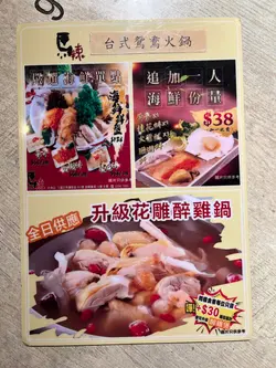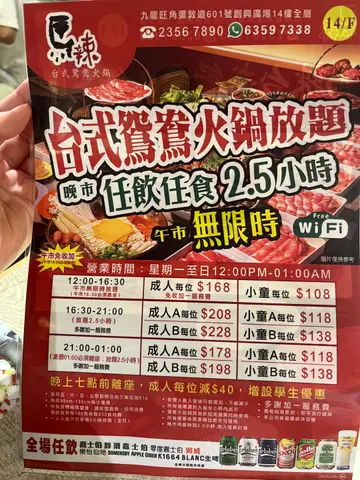 旺角呢间麻辣台式鸳鸯火锅超多人,都排左好耐队🫣试下究竟好唔好食?间餐厅由中午12:00开始去到凌晨1点,开放时间都几长~今次我哋晚上入座,我哋拣咗$228的B餐,包火锅任饮任食2.5小时!时段由lunch到宵夜都覆盖到,慢慢叹都有充裕时间,啱晒一大班朋友聚会🍻我哋嗌咗花雕醉鸡锅同埋佢哋最出名嘅台式麻辣锅汤底~花雕醉鸡锅根据食客每位加$30,有半只鸡花雕生鸡自己放落去~煮几分钟就食得啦!鸡肉都几滑,而且酒味浓郁,都值得一试💪花雕香扑鼻,热气升起𠮶阵酒香更明显另外麻辣火锅系佢哋招牌,唔算太辣,辣度都几友好,带有小小药材味,入边仲有鸭血,都值得一试~药材香同辣感平衡到位,鸭血滑溜入味,啱晒唔食重辣嘅朋友🌶️如果饮酒嘅话仲有生啤饮任饮~另外仲有多款汽水茶饮,饮品种类都多!啤酒控可以尽情畅饮,唔饮酒都有汽水同茶饮拣,配辣锅好解腻🍺肉类都非常丰富,呢个餐有极尚无骨牛小排、手切肥牛、一口牛、顶级牛梅花、特选安格斯黑牛、精选牛五花、黑豚五花肉~牛羊猪款式一应俱全,落锅秒速吸汤,肉香即刻弹出嚟~个人觉得牛小排比较嫩滑同埋腍D,牛梅花相对牛味浓郁啲但系就冇咁腍~可以先试牛小排感受嫩滑,再用牛梅花追返浓郁牛香,两款交替食更满足👌B餐仲多左白鳝片、海鲜虾、黑毛猪梅花、顶级小肥羊、脆肉鲩、鸡子、纽西兰青口~钟意食海鲜可以直接拣B餐,其实都系贵$20🤤海鲜同肉类一次过兼顾,$20升级换嚟更多选择,CP值几高🦐如果嫌唔够食,外面仲有近百款火锅配料~蔬菜、丸类、炸物都应有尽有!食饱之后仲可以去甜品区,有面包布甸、窝夫同埋棉花糖~咸甜收尾都有照顾到,食到最后都仲有小确幸🍮🧇间餐厅都非常得意,如果攞住任何香港嘅消费单,喺晚市惠顾仲可以减$20,记得带齐消费单,小小优惠都系钱,埋单更开心~…查看更多