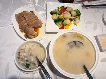 位于香港仔中心商场内的「驷马拖车」潮汕饭店,是一家保留著传统酒楼格局的潮州菜馆。餐厅环境整洁卫生,店内设有不少六至八人的大餐台,非常适合一家大小来此聚餐,这间主打潮州菜,早午市饮唐茶食港式点心。今日跟朋友来叹茶,点了卤水鹅真系好食。🌟招牌卤水鹅,切成薄薄的鹅片,排列得整整齐齐,卤得够入味的鹅肉,皮质滑溜不油腻,肉质有弹性却不会过份紧实,也不松散,恰到好处。特别值得一提的是,下层铺垫的豆腐充分吸收了卤水的精华,配白饭一流。🌟蚝仔粥,同样煮得出色,每只蚝仔都饱满肥美,配上鲜甜的米粥底,喝一口就能感受到海鲜的鲜味。🌟潮州沙茶安格斯牛肉河,跟广式炒牛河有些分别,潮式是加入沙茶酱搭配上新鲜牛肉,介乎干炒与湿炒之间,嫩滑的牛肉被香喷喷的沙茶酱汁裹着,酱汁也挂满每条河粉,味道浓郁又爽滑,超好味。🌟彩虹虾饺皇,一笼四只,皮薄晶莹通透,内馅的鲜虾大大只,一口咬下非常爽脆鲜嫩。🌟 银杏芋泥绵密幼滑的质感,带有浓郁的芋头香,银杏更带来回甘的层次,甜蜜好味。…查看更多