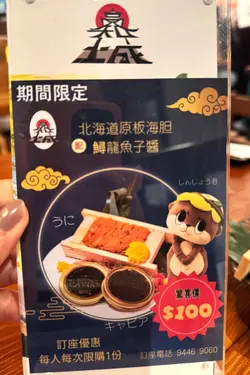 老友果然识饮识食, 他订了位放工后一齐去饮清酒, 食日本餐, [高知城] 位于铜锣湾 骆克駅, 门面日式装修, 好吸引.面积够大, 有酒吧, 店员招呼不错, 我们坐下即送上 绿茶.墙上有介绍食品, 及 日本清酒放题两小时, 可以享用多款清酒, 好正 !大家决定开心饮, 朋友先取 日本北鹿出品的纯米吟酿北秋田, 带浓郁水果香. 餐牌食物选择多, 有送酒小食, 串烧, 刺身, 寿司, 料理. 点餐无难度, 我们台上这推广牌非常抢眼......北海道原板海胆配鲟龙鱼子酱. 即落单 !!服务员送上 北海道 原板海胆配鲟龙鱼子酱, 令大家即时眼金金, 每人一板 海胆, 金黄色好鲜明, 鲟龙鱼子酱 像珍珠般名贵, 圆润饱满, 细腻光滑, 质素非常好,把海胆及鲟龙鱼子酱 放进紫菜上, 卷起来, 送入口, 好吃得飘飘然, 真回味