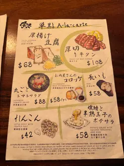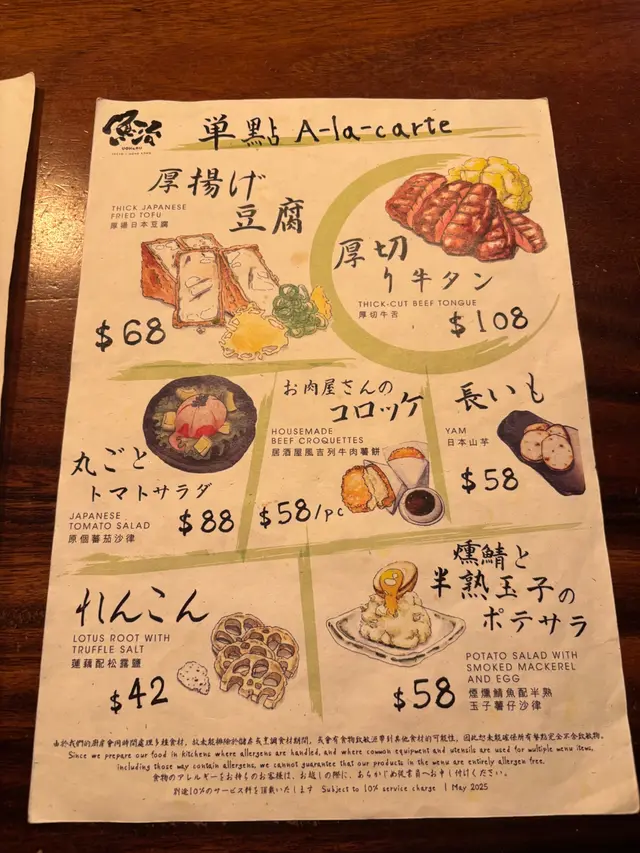 淮山海鲜大阪烧 Okonomiyaki with Yam and Seafood ($78) ★★★★✰此与传统面粉感重的大阪烧很不同,而是使用淮山作为淀粉,有点像薄批薄饼,加上大阪烧的mayonnaise、酱油、木鱼丝,味道不错。表面的虾仁也爽口。整体而言,虽然是集团餐厅,餐牌食物选择也不如一般其他居酒屋多,但这间餐厅以同区同类食肆来说价钱非常合理,坐得舒服,店员服务周到,也值一个solid的「
