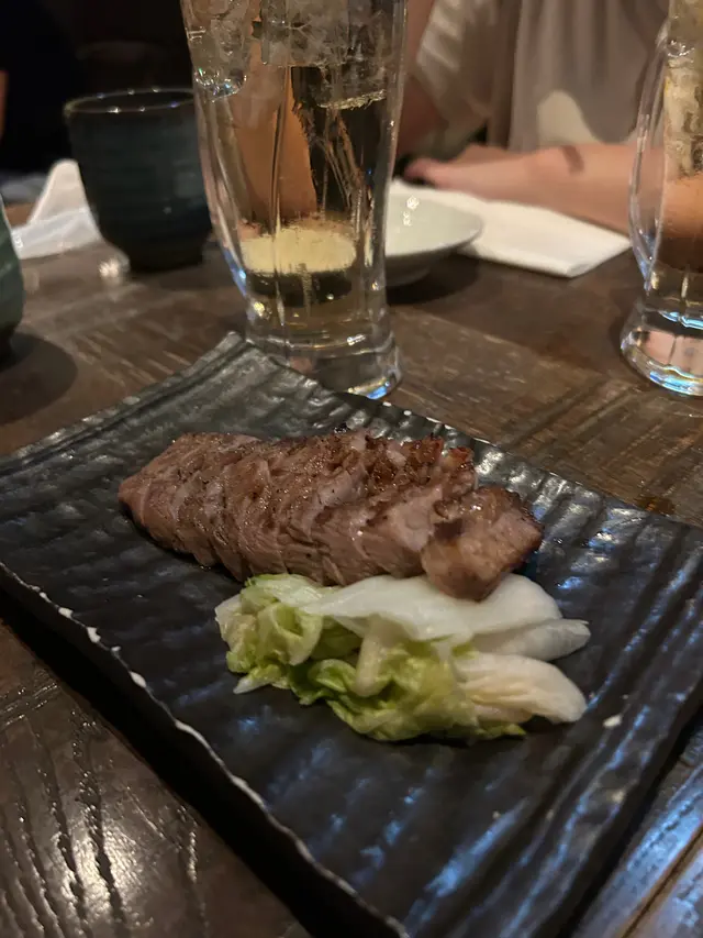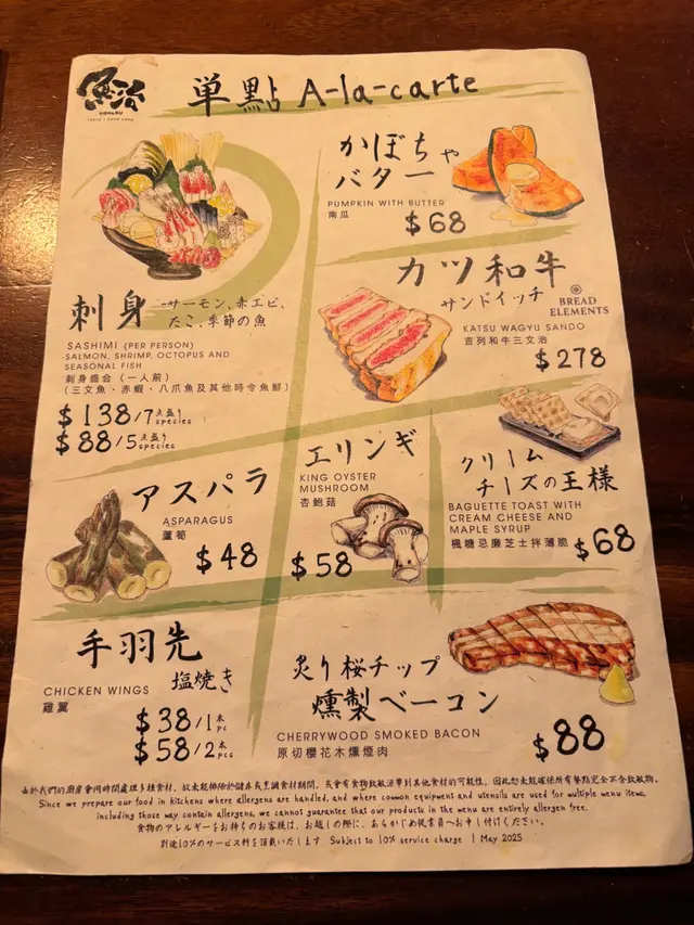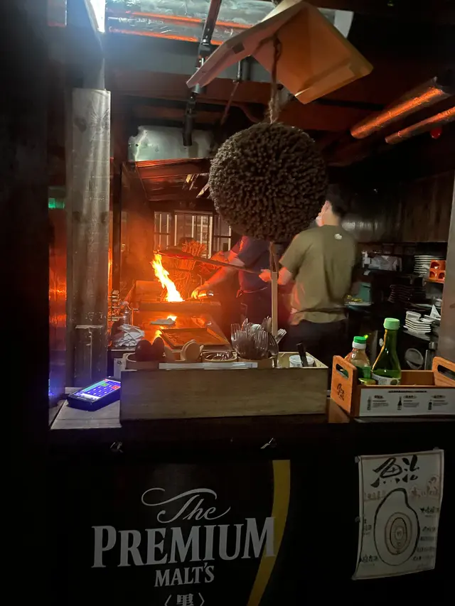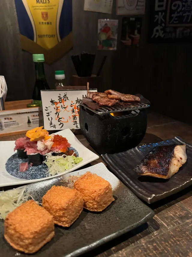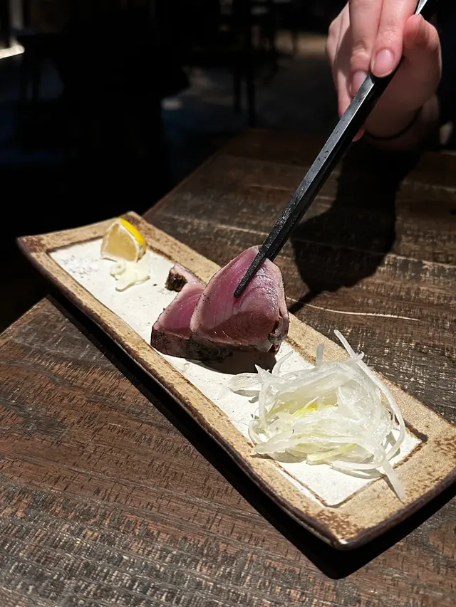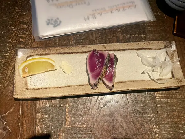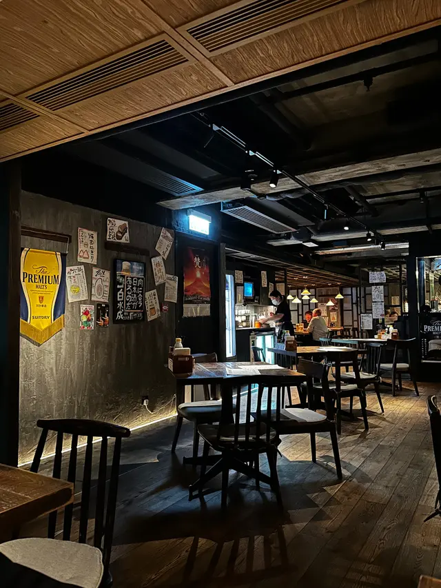 晚上在中環區尋找日本菜,很多都價錢昂貴或是已經滿座,唯獨這間M88樓上的日本菜感覺價錢比較相宜,環境也很有日本地道居酒屋感覺。入座後才發現這間餐廳是美心集團,但從環境、裝潢、餐牌上都完全沒有「美心味」。入座不久後餐廳便關燈,然後店員擊鼓,原來每晚都有個「禾稈草燒鰹魚」表演,火光熊熊、煙霧瀰漫,算是幾特別的經歷。表演完每人獲分配一塊鰹魚魚生,感覺都幾新鮮,魚皮表面還有些烤焦味。