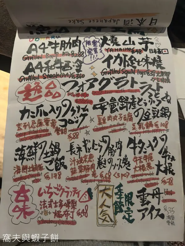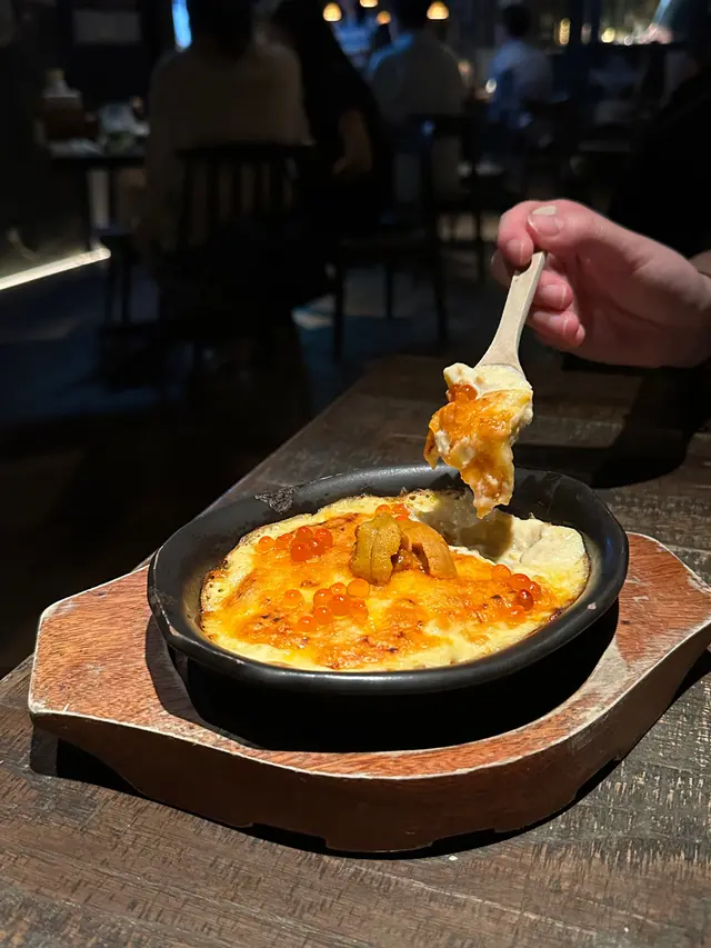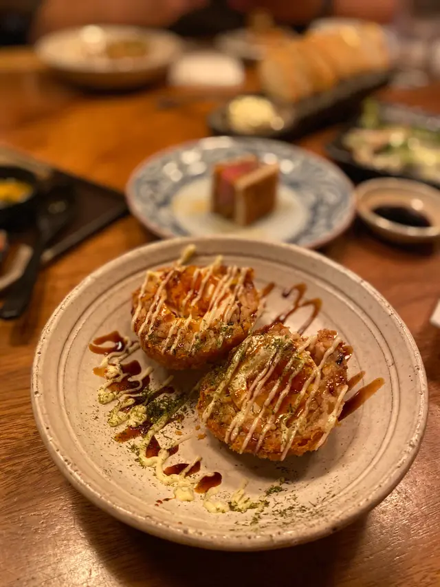 淮山海鮮大阪燒 Okonomiyaki with Yam and Seafood ($78) ★★★★✰此與傳統麵粉感重的大阪燒很不同,而是使用淮山作為澱粉,有點像薄批薄餅,加上大阪燒的mayonnaise、醬油、木魚絲,味道不錯。表面的蝦仁也爽口。整體而言,雖然是集團餐廳,餐牌食物選擇也不如一般其他居酒屋多,但這間餐廳以同區同類食肆來説價錢非常合理,坐得舒服,店員服務周到,也值一個solid的「