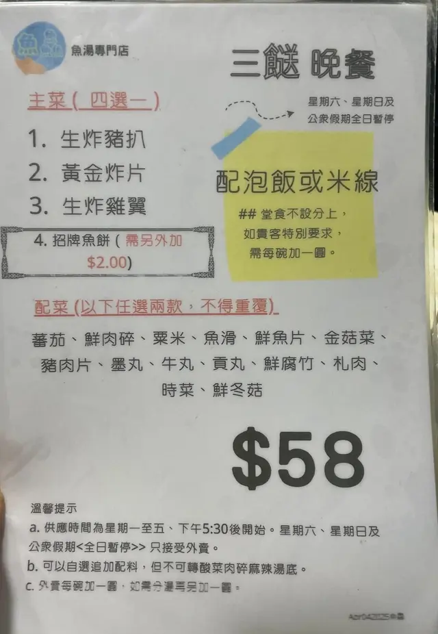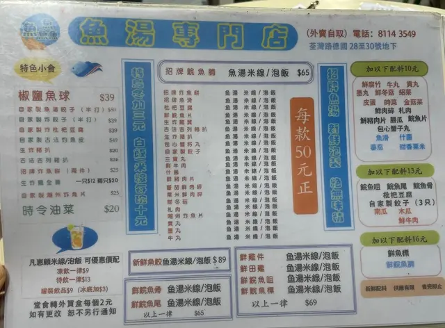 今次嚟到荃灣 試下喱間主打鮮魚靚湯嘅小店 不過感覺實在太差 六點零坐低唔算多人 雖然店員講咗背包可以掛頭頂 但眼見全場勁多吉位 咪諗住拉張吉椅放低 有人嚟我自然識趣拎返啦 但店員好似好唔滿意 堅持背包不能放椅子 這是小店的執著 仲見到原來温馨提示咗大家 貼好咗標貼在牆身 其實無問題嘅 你有你執著 但有好多吉位時 你嘅執著咪令人覺得你唔識做 好老套囉 相信小店主打街坊生意 你識做我識做 有人入嚟唔通我仲死霸張椅嚟放嘢咩 無必要咁樣要求客人堅持你嘅執著呀 講緊嘅係客人觀感我哋將抹手後啲濕紙巾放喺枱面 店員好無禮貌又好不屑問 你哋架? 然後收起 個樣勁不滿咁 嗌完嘢食 用力劈低張單喺枱面 都唔知發生咩事 感覺極差 聽到佢對其他客人都係粗魯拋低食咩呀 好似前世欠你咁嘅態度 講完服務 講食物質素 我滿心期待佢哋嘅湯底係濃郁魚味 但一食已經覺得啲湯好似係魚湯溝咗大量清水溝淡咁 好聽係清清淡淡 難聽係溝稀咗嘅湯底 米線尚可 軟硬適中 我哋揀咗炸魚餅同枇杷豆腐米線各一碗 炸魚餅唔錯嘅 有魚肉味 將魚肉剁碎壓餅炸 比較薄身 但口感唔錯 少少彈牙 枇杷豆腐就差啲 肉質好散又唔嫩滑 魚肉味豆腐味欠奉 唔知食緊咩咁我哋另外再加咗個炸魚片 以為係平時食開嘅魚片 點知佢係好似炸蝦餅質地嘅炸魚片 估佢唔到 但佢質地又未做到好似蝦片咁脆 佢中間咬落去係好似受潮咗嘅薯片質感咁 至於味道係有啲魚味嘅 但唔叫好味仲有加多碟全走菜 揀咗菜心 係勁粗壯嘅 煮淋到完全唔想食落去 我個人口味鍾意食較生較硬嘅菜 但佢完全係唔駛用牙咬都得嘅淋度凍飲或可樂要另外加9蚊 如果佢魚湯係真材實料又香濃都叫值喱個價 但咁嘅質素收50蚊就真係不值 整體而言 喱間小店質素低下 主打魚湯無味 魚肉製品亦未見出色 環境唔算狹窄 一張大圓枱 相信係容納唔同搭枱客嘅設計嚟 舒服唔稱得上 但喺小店嚟講算闊落 不過間鋪咁嘅趕客服務態度真係唔知點吸回頭客或令人想幫襯 不過我理解 有機會啲人係食情懷 可能係街坊生意 但喱種情懷係咪應該加多幾分禮貌會令人更加珍惜呢 公道地說 係其中一個唔知係咪老闆娘嘅態度最差 亦有有禮嘅店員在場嘅 講真 香港服務質素低下係眾所周知 如果今時今日仲有街坊幫襯捱得住 唔係要珍惜有禮一點對待客人嗎 食物已經無質素 加埋咁嘅待客之道 真係無語 …查看更多