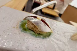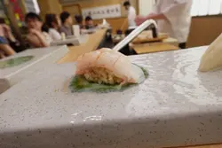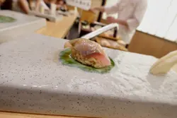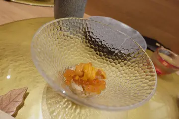 $398 共18品,CP值高!「鮨政 x 大湖」亲民版的厨师发办,质素如何?试过方有发言权!喜出望外,组合富心思,款式全面,制作认真,调味恰到好处,份量足够食得饱。面积不大,全店只有一张寿司枱,可容12人,必须订位。金菇茶碗蒸造型几靓,见到已经好想食,面头啲金菇似瑶柱,入口富咸香更似,蒸蛋非常滑溜,内藏冬菇、肉粒、银杏,足料制作,味道丰富。白身鱼刺身.油甘鱼刺身北海道水八爪鱼色泽雪白,蘸少许竹炭盐吃,一片比较爽,另一片有适量嚼劲。油甘鱼已配上鼓油,回甘味甜,很讨好,可加日本芥末添辛香。矶煮鲍鱼伴肝酱配合自身鲍鱼肝汁的做法无得输,丰腴滋味,跟一口饭最完美,鲍鱼伴肝酱菜式,永远都是亮点。吉列带子伴他他酱吉列帆立贝、他他酱、三文鱼子及紫菜的组合,呢道真心好好食,够热够脆,层次丰富。帆立贝酥脆味鲜,他他酱添润泽,以紫菜包著增层次。角煮豚肉.苹果蓉,青椒非常懂得配,咸甜味道、果酸与肉平衡得很好。有肥膏的猪肉上、添加苹果蓉有助平衡肉腻且添食味,仲有汤汁,又系甜甜的,滋味不腻,最后咬一口青椒,少许辣而已。寿司每一件皆已调味,用上酸度正合我意的赤醋米,刺身新鲜,有鲷鱼、深海池鱼、赤虾、鲭鱼、帆立贝、真鲷。炸沙追鱼热辣辣,如薯片般薄而香脆,炸酱超薄。招牌飘雪鹅肝吞拿鱼寿司招牌菜,在吞拿鱼赤身寿司上、刨下大量红酒煮鹅肝,吃法很有新鲜感,鹅肝以红酒浸腌过已减腻感,再刨成碎粒,轻盈得多,肥美感却保持,溶化在吞拿鱼寿司上,食味大大提升。角切鱼生卷我认为是角切鱼生饭的迷你精华版,有两三款鱼,口感鲜美。海胆甜筒想不到与雪糕甜筒配,更加甘香超甜,极之美味。海鲜汤真材实料久熬而成,奶白汤头,味醇厚。季节甜品即系新鲜水果,超甜蜜瓜,完美的结束。…查看更多
