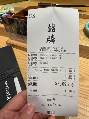 上环有好多间🇯🇵厨师发办お任せ,「鮨燐」CP值好高,绝对可以encore!最近仲做紧午市75折优惠,HK$348/位起就可以食到12道菜,从开胃前菜到甜品 ,其中有8款寿司🍣,真系好抵食!☺️我哋今次Farewell同事,所以就豪气啲拣左HK$1680/位嘅晚餐,卖点在于其7款刺身~💕食材新鲜,份量足,真系食刺身都够饱~😂从开胃前菜到甜品 ,其中有6款寿司🍣,当中竟然有马粪赤海胆😍😍,总共17品。🔸先付:金平莲藕· 半片· 鹅肝莲藕薄片味道咸甜,爽脆开胃;半片(はんぺん)质地如豆腐般绵密,口感柔软,配上明太子酱,味道好惹味!😋鹅肝米纸,香脆米子和软滑鹅肝形成强烈嘅对比~🥰🔹刺身1️⃣富士山🗻养殖鲑鱼打破左鲑鱼=橙白相间嘅既定印象,白富士山鲑鱼强调其白色的鱼身和细致口感🫦,最重要‼️系无寄生虫问题,可以放心食用!🥴鲑鱼加上柚子皮、盐、芝麻等简单调味,就咁食就得,完全唔洗蘸寿司豉油都好够味!😊一份有4块,份量十足!🔹刺身 2️⃣北海道北寄贝肉质厚实,味道鲜甜爽脆。🔹刺身 3️⃣兵库县 真蚝🦪 加上简单的酸汁啫喱,就已经好正~蚝味较为浓郁,略带甘甜,但又不失海水🌊的咸鲜,加上爽脆口感,令人想再啪多只啊!🥰🥰🔹刺身 4️⃣秋刀鱼秋刀鱼是🍂秋季季节性鱼,小编平时食鱼都唔够胆食鱼腩,因为觉得好腥🥲,但今次大胆一试,竟然有意外惊喜!😳值得钦佩嘅系💕,师傅嘅「白刀切」真系好劲💪🏻!刀功好到一条细骨都冇,鱼肉口感保持爽弹,仲好食过最近喺福冈食嘅!🤩😂腩位鱼油脂香,配上姜葱、豉油,鲜味十足~😌🔹刺身5️⃣ 白子都是秋季🍂季节性产品。店家自慢的白子,用昆布高汤处理过,入口完全💯冇腥味☺️,微韧的外层一咬即破,清香鲜甜,带奶油般嘅浓郁感,入口即化~系香港🇭🇰食过最好食的白子!美味しい🤤🔹刺身6️⃣ 北海道养殖银雪鱼新鲜银雪鱼用柠檬🍋豉油腌过,鱼肉肥美滑身,鱼油脂香,冇谂过银雪鱼可以咁正!😂🔹刺身7️⃣ 拖罗是我今趟Omakase大好き❤️的第一位🥇!集大、中拖罗和赤身于一身的拖罗三重奏,用紫菜包着三兄弟,搭配紫苏叶、芥末、葱花,油香满溢~🥰🥰👍🏻🔸和食:海鳗·舞茸菇·芦笋天妇罗🍤新鲜热辣即炸,炸皮薄脆,舞茸菇味香浓;芦笋鲜嫩爽脆;海鳗软滑。🔹寿司🍣1️⃣ 九州深海池鱼采用左池鱼的鱼腩位,鱼肉油脂丰富,口感爽滑,无可挑剔。😽🔹寿司🍣2️⃣ 神奈川黑鯥鱼秋冬季节是味道最佳的时节。😈鱼皮轻微炙烧过,以逼出油脂,及增加鱼肉的香气,配上店家特调面豉酱,鲜甜味美。😇🔹寿司🍣3️⃣ 神奈川太刀鱼太刀鱼涂上面豉后炙烧过,配上海盐,突出其鱼肉厚实嫩滑的口感。😙🔹寿司🍣4️⃣ 牡丹虾🦐新鲜的牡丹虾,配上炙烧过的虾膏,一次过品尝到原只虾的鲜甜,perfect!😎🔹寿司🍣5️⃣ 筋子秋冬季节是味道最佳的时节。😈自家腌制过,所以味道比较甜身,用适量嘅柚子皮提鲜,更突显出筋子的鲜甜~🥰🔹寿司🍣6️⃣ 海胆用上马粪赤海胆,仲要足足一行!😍🤩味道甘甜味美,余韵柔长~真系好正🙌🏻!🔸お椀 面豉汤:味道唔会死咸,可以清一清味蕾。🔹デザート甜品🍵:自家制的奶冻配上抹茶🍵和黑豆甘露煮,奶冻软滑而不膻,平时唔钟意食奶制品的小编都觉得好味道。👍🏻🥰在香港🇭🇰食过好多间Omakase,「鮨燐」整个菜单都好啱食,例如同事唔食内脏或鳗鱼,师傅就为佢贴心安排左其他,可以tailor-made,虽然晚市唔算平,但真系一分钱一分货,贵少少🤏🏽都贵得有道理!😎…查看更多