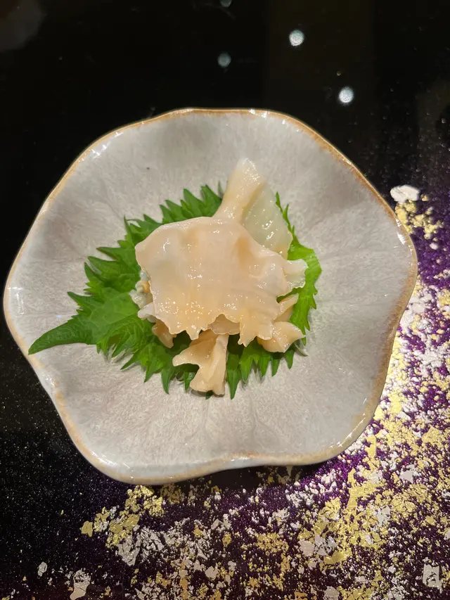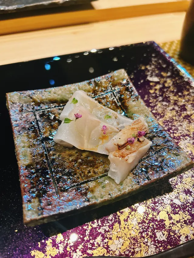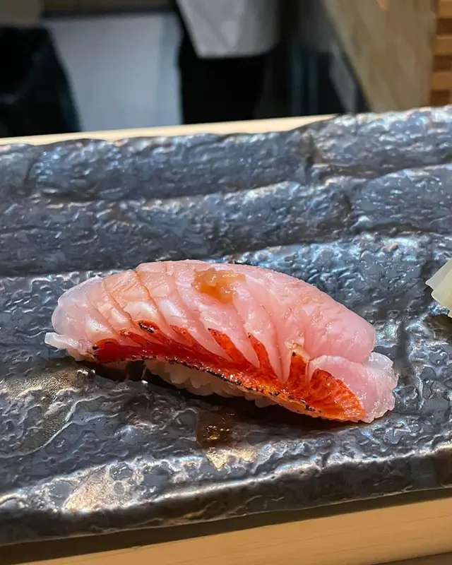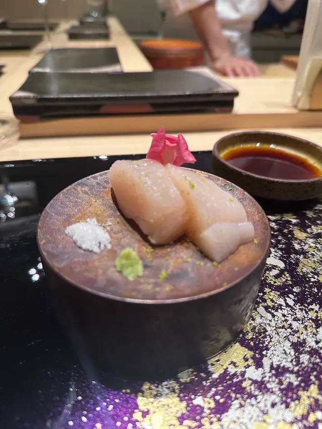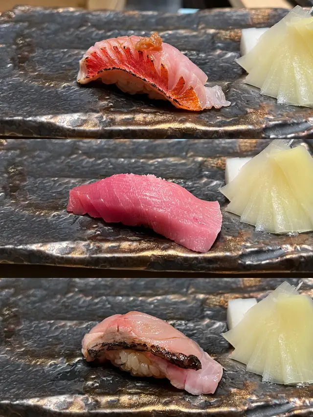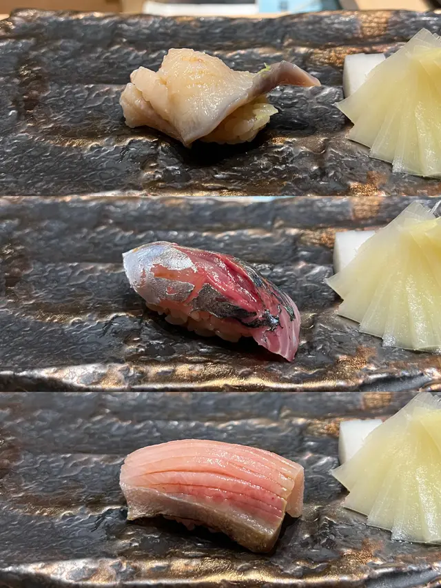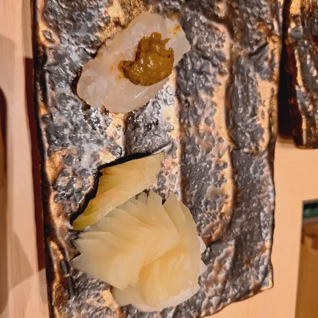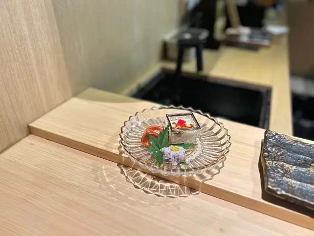 這道前菜以靜崗水果蕃茄為主,入口酸味帶有一絲回甜的風味,非常清新。接著是水澐海藻和帶子,海藻的口感嫩滑,帶子鮮嫩可口。接下來是長崎真鯛,魚肉鮮美,帶有微甜的味道,配上紫蘇花的香氣,令人垂涎欲滴。肉質彈牙爽口,十分美味。隨後是兩種貝類,𨋢貝和赤貝。𨋢貝的口感咬上去後散發出清甜的味道,赤貝也不遑多讓,味道鮮美。白只搭配辣椒蓉和銀雪魚,味道相得益彰,非常搭配。鰤魚的油脂很重,但芥末和柚子醬的配搭平衡了油脂的濃郁感,讓口感更加豐富。接著是燒過的春魚sawala,魚油的香氣在燒烤中散發出來,搭配微燻的紫菜,非常美味。燒呑牙魚鮫則散發出濃郁的油香,令人食指大動。石門鯛壽司中的海膽份量十分慷慨,味道豐富,類似墨魚的口感也很有特色。目仁奈魚壽司已經加了醬油,再搭配蔥,味道更加豐富。系撚鯛壽司的飯燒得剛好,軟熟的口感很好。關鯖魚壽司的味道較重,帶有濃郁的風味。鮑魚青酒湯則搭配了柚子皮,增添了一絲清新的味道。最後是呑牙魚拖羅壽司和醬油漬中拖羅壽司,呑牙魚拖羅壽司的味道近似魚鮫,並帶有海鹽的風味,醬油漬中拖羅壽司則是以醬油漬製成,味道鮮美。整體而言,這道食評評論了各種前菜和壽司的口味和特色,食材的選擇和搭配都很出色,令人回味無窮。師傅及店員服務態度一百分。…查看更多