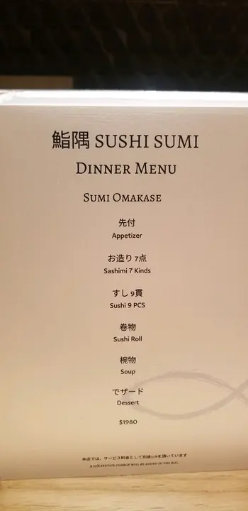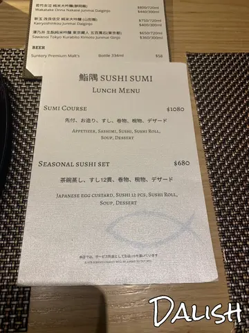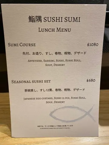 托寿星的福来了场omakase飨宴。师傅功夫了得,除了每道菜皆有水准之外,无论是lunch course或是sushi set,菜品的顺序都值得赞赏:各种食材所带来不同的滋味,在Jason师傅的安排下,依序出场,口味淡浓在口中交错、叠加,宛若不同乐章,让我们享受了一场味觉的交响乐。这次午餐我个人的前三名:1. 云丹军舰(图一):一贯军舰用上一排北海道海胆,搭配脆海苔,简单暴力的美味,让人感到满满的幸福感。因为怕海苔变软,拍照没对到焦,也来不及检查,就速速把它送入口中。2. 煮𩽾𩾌鱼肝(图四右上):可能是第一次吃到认真的𩽾𩾌鱼肝,这里的鱼肝口感绵密,令人惊艳。我自己觉得口感尝起来有点像猪脑哈哈,虽然这样说可能反而会让人却步。3. 炙烧金目鲷握寿司(图三正中):金目鲷我吃过,但这么好吃的炙烧金目鲷没有。上桌时我没有看出外表有炙烧过,我还在跟师傅说「让我猜,这个鱼我认识」,在放入口中的那瞬间,我惊呼,原来有炙烧过!那恰到好处的焦香来衬托金目鲷本身的味道,我又只能用惊艳来形容了。寿星的最爱是:烧鲣鱼佐针葱(图四左上)寿星表示烧鲣鱼肉质Q弹却又入口即化;而这道菜让我回想起跟父亲一起去日本四国旅行时,在高知市的市场里吃到的稻草烧鲣鱼,真是令人怀念的时光啊。另外令人惊喜的还有最后的干瓢卷(图四左下)以及赤贝寿司(图三左下)。师傅自家腌的干瓢(葫芦瓜),和小黄瓜一起做成的卷物,超乎我的预期,是腌菜却又不似腌菜,亦是一绝。我一般不爱点贝类的寿司,因为我觉得容易有腥味。师傅说够新鲜就不会有腥味,那他家的赤贝应该真的够新鲜了,没有腥味又爽脆,改变了我对贝类的看法。疫后报复性旅游季,留在香港的我们获得免费包场。甫入座时师傅不发一语,让我们有点小紧张,后来食物上桌后,好奇的我开始发问、撩师傅聊天,也成功让师傅分享了关于食材的专业,还有他在看的台湾开餐厅的综艺节目XD。感谢好友推荐了鮨隅Sushi Sumi给我,我也推荐大家想吃寿司的时候可以去Sushi Sumi😋Sumi Course (Lunch): HK$1,080 +10%Seasonal Sushi Set: HK$680 +10%Visited on 1 April 2023