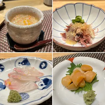 餐厅装潢平实雅致,简约和风,有传统木制寿司吧枱,可以欣赏主厨既手艺。萤光鱿鱼配酸面豉酱,富山湾当季既萤光鱿鱼,酸酸甜甜,好开胃。长崎县产小长井珍蚝,饱满,淡淡既海水味,清新鲜甜!野生石鲷、鲣鱼配日本洋葱汁煮𩽾康鱼肝🐟入口溶化,满满鱼油香盐烧海鳗鱼🐟酥脆可口寿司有带子、沙甸鱼、宫城县产野生吞拿鱼(赤身、中Toro)、小肌、火炙金目鲷等。一共17道料理,食材都很新鲜,有唔少惊喜,其中宫城县产野生吞拿鱼,鱼味香浓。北海道马粪海胆,很新鲜,味道甘甜带清香,口感幼滑!