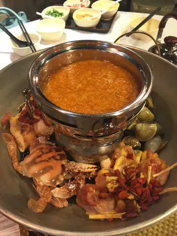呢间火锅店都颇有名气,之前杂志都有介绍过,佢最特色嘅系佢嘅装修,成间餐厅装修到好似以前旧式嘅街市咁,仲要有新鲜海鲜档,俾你自己亲自去拣,肉都系新鲜切嘅,地道香港打边炉食物选择方面,都几多选择,有埋新鲜海鲜同埋首设本地牛肉选择叫完嘢食之后,职员即刻上咗个调味架我哋嗌左花胶鸡汤底,汤底嘅用了10分有诚意,有十几块花胶同埋大约半只鸡左右嘅份量,鸡汤非常之浓郁,亦都好有胶质,饮完系将住咗成个口嘅食完汤料同埋饮完汤之后,就可以叫职员帮手茄汤开始打边炉配料方面,我哋叫咗脆鱼鲩片、皮蛋咸牛丸,韭菜饺同埋油麦菜所有配料都新鲜好味,配埋个汤底一流唯一要改善嘅可能系环境卫生,因为地下有啲牌黐立立…查看更多