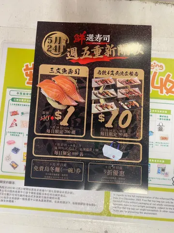 第一次食鲜选寿司🍣闲日收工时间大约七点到达望入餐厅, 见到人流唔多, 大概只占一半生意唔算多, 可能荃湾食肆选择太多了既然唔使等位, 咁试吓又无妨油甘鱼、北寄贝、赤贝、虾三味、帆立贝都好食👍🏻够新鲜火炙寿司方面朋友食咗火炙三文鱼、油甘鱼、赤贝、帆立贝都话好食👍🏻熟食方面食咗虾天妇罗乌冬佢冇得安排天妇罗另上当碗乌冬送到, 我哋即刻夹起旧天妇罗🍤热辣辣, 炸浆好食, 虾肉都新鲜乌冬就正常味道, 冇乜特别餐厅有限制90分钟用餐时间上菜速度好快, 所以完全够晒时间食整体感觉比预期中好会再帮衬👍🏻😁…查看更多