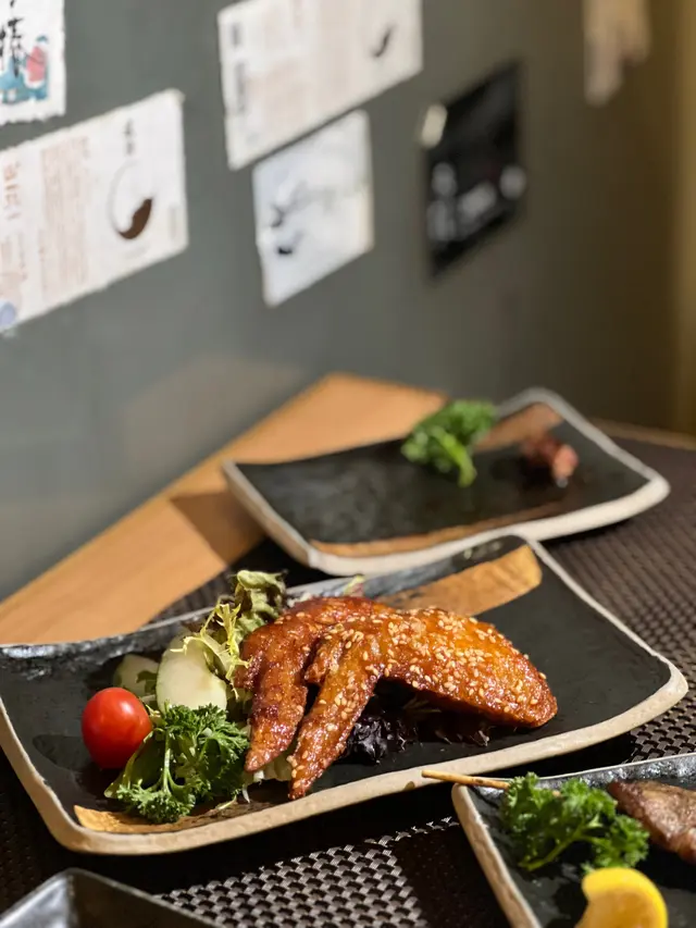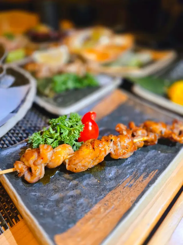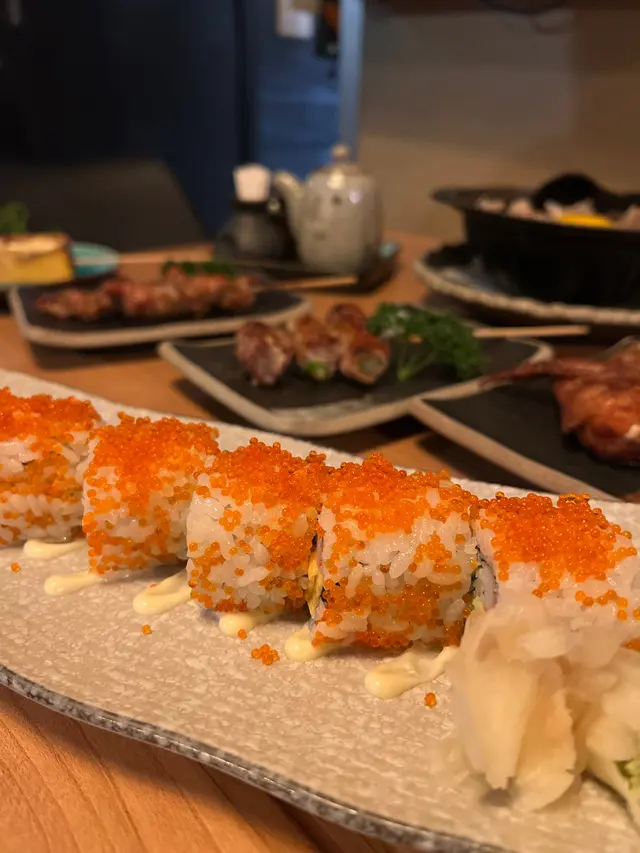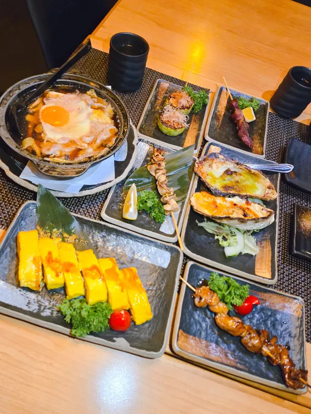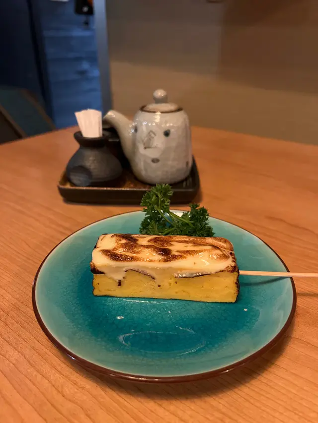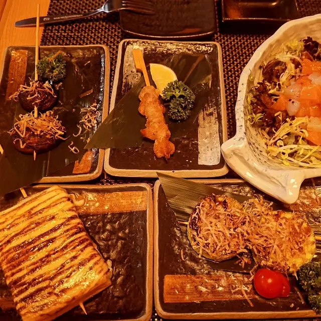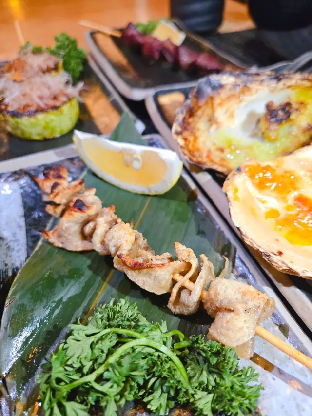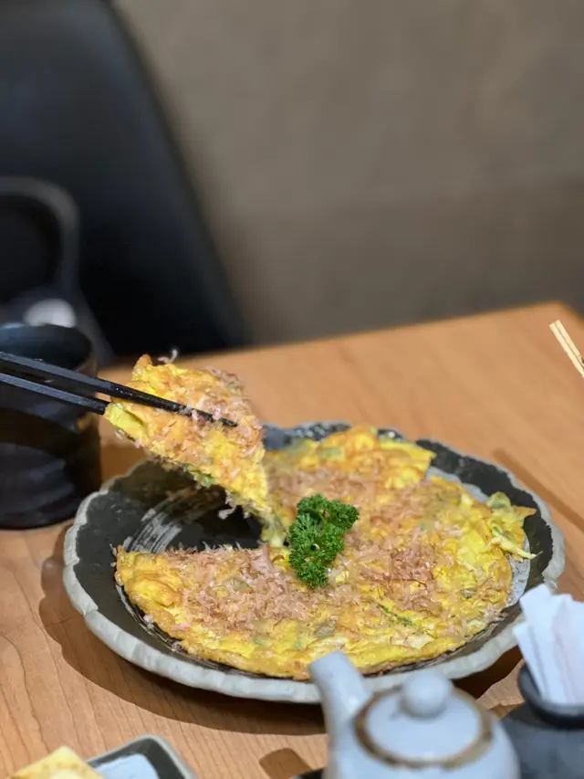 依間樓上日本餐廳坐得幾舒服,裝潢經典日系,木枱凳坐得舒服😌。侍應服務細心,會適時替我們執拾及加茶。蟹籽沙律沙律🥗夠凍幾好食😋。切成幼絲口感幾好。雞腎串及七味燒粟米🌽串燒幾惹味有咬勁。七味燒粟米去核,外面很少見,一粒粒口感過癮。木魚絲苦瓜玉子薄餅🍕遠睇係pizza但食落個「餅底」係蛋餅,又扮得幾似;個味調得幾香。配料苦瓜唔苦幾易入口有甘香餘韻。鐵板牛舌粒有驚喜!小食用鐵板上菜,炸炸聲熱烘烘,牛舌有很多汁好juicy,切到粒狀肉質好嫩滑。牛油果🥑軟殼蟹卷--軟殼蟹超脆身。…查看更多