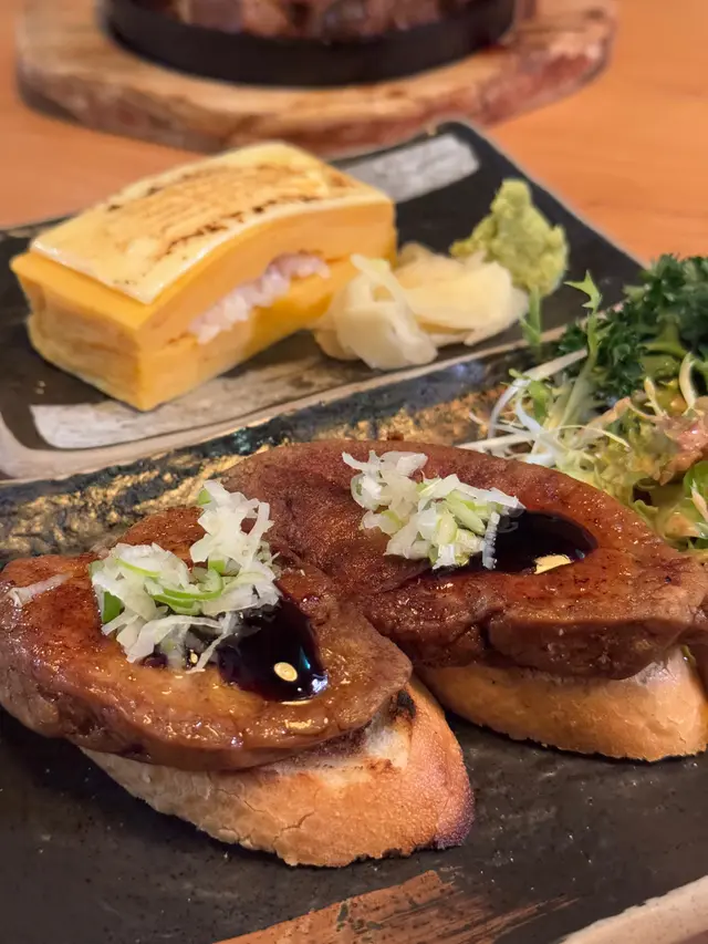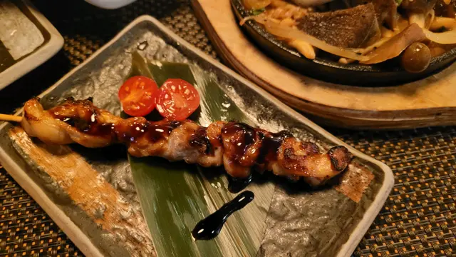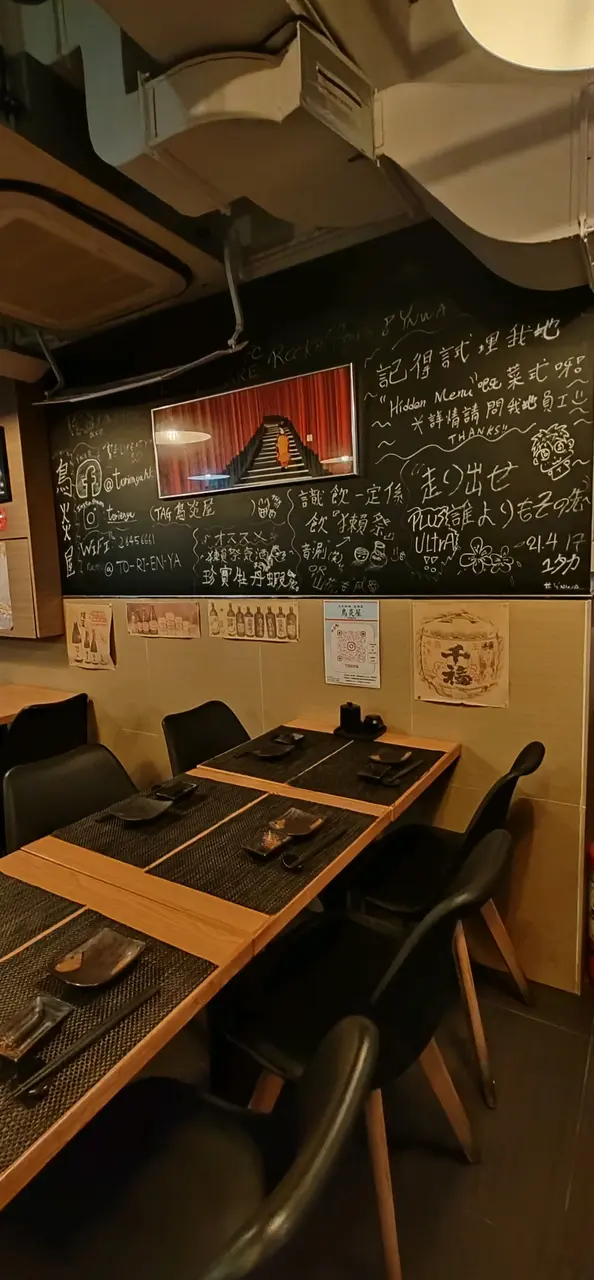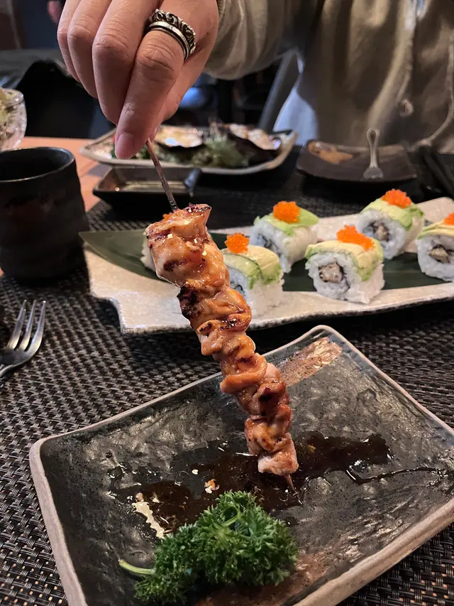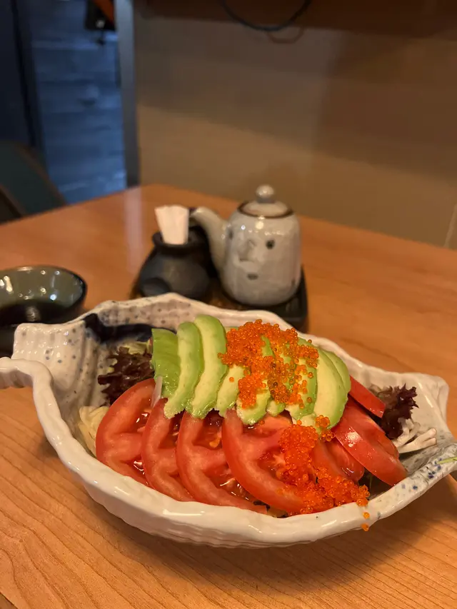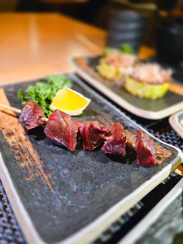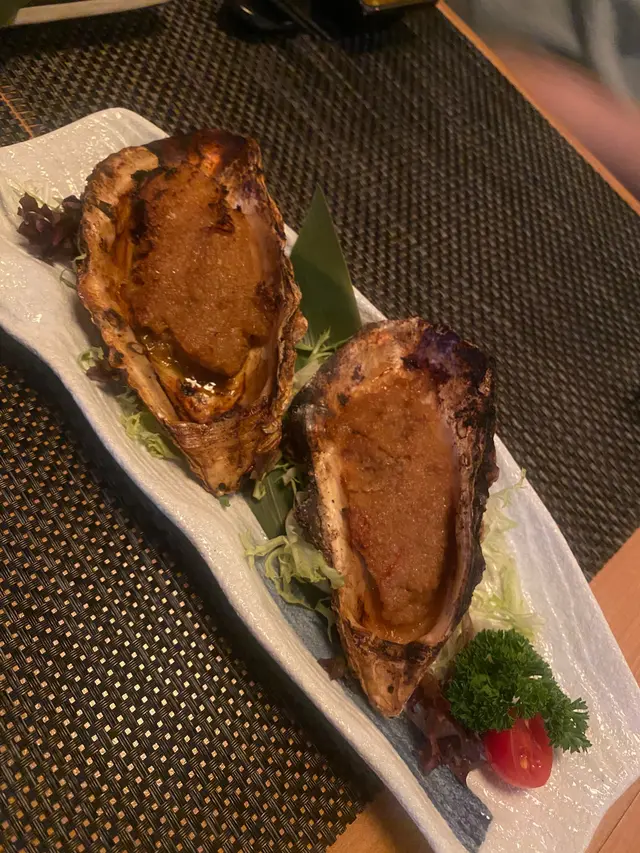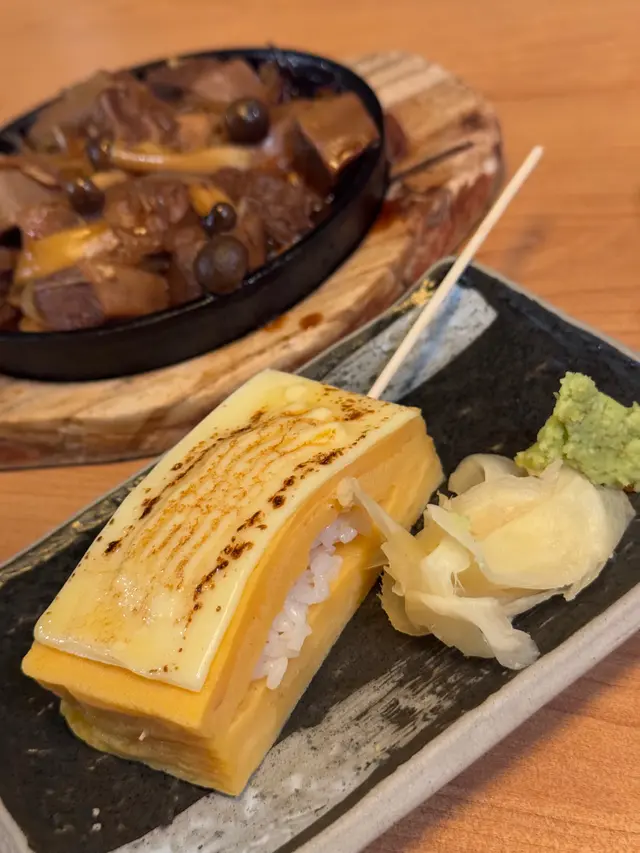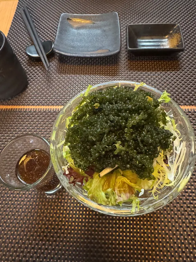 依間樓上日本餐廳坐得幾舒服,裝潢經典日系,木枱凳坐得舒服😌。侍應服務細心,會適時替我們執拾及加茶。蟹籽沙律沙律🥗夠凍幾好食😋。切成幼絲口感幾好。雞腎串及七味燒粟米🌽串燒幾惹味有咬勁。七味燒粟米去核,外面很少見,一粒粒口感過癮。木魚絲苦瓜玉子薄餅🍕遠睇係pizza但食落個「餅底」係蛋餅,又扮得幾似;個味調得幾香。配料苦瓜唔苦幾易入口有甘香餘韻。鐵板牛舌粒有驚喜!小食用鐵板上菜,炸炸聲熱烘烘,牛舌有很多汁好juicy,切到粒狀肉質好嫩滑。牛油果🥑軟殼蟹卷--軟殼蟹超脆身。…查看更多