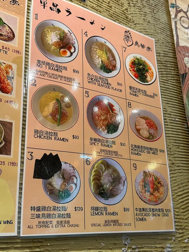 鸟华亭, 位于湾仔交加里, 店子不大, 感觉好像去了日本新宿的居酒屋,门外挂满日式灯笼, 带著日本浓情. 师傅勤力地工作, 食堂内气氛热闹.店员安排给我们的座位颇好, 台上有冰壶, 抹手纸, 调味粉, 好方便.看看彩色照片, 点品清晰无难度. 小食以鸡为主, 款式不少, 配拉面至夹. 店员提供落单纸, 大家填上喜好便可, 简单快捷. 我们一起点面. 面条, 可选择种类及软硬度. 另外辛辣面, 可分少辣, 中辣, 大辣.我 点了 至极鸡白汤拉面 $99热热的送上, 先吃片 低温慢煮的鸡胸肉, 入口绵滑.伴有炸莲藕片, 香口爽脆. BB 芦笋, 鲜嫩 . 最开心有溏心蛋, 蛋黄半熟成膏状. 面条拣了卷面, 较粗身, 口感爽滑. 奶白色高汤用鸡骨熬成, 呷一口汤, 汤味浓 , 超正 ! 朋友叫了 鱼介白汤拉面 $93 汤头以豚骨及鲣鱼熬成, 浓 陏绵密, 带海鲜风味, 配上幼身直条面, 慢煮鸡胸肉及芦笋, 相当可口.追加小食, 叫了 明太子鸡翼, 及每月推广: 任何拉面 +$28 有 Uni Cream 流心忌廉饼明太子鸡翼, 鸡翼的皮烤得香喷喷, 肉质滑嫩鲜甜, 里面更是装满了明太子, 味道浓郁香口 又带些小微辣, 人见人爱Uni Cream 海胆流心忌廉饼, 即叫即制, 上台热腾腾. 入囗 酥香又不油腻.师傅专业有水准, 煮出正宗日本浓汤拉面, 值得推介.下次有时间来叹 Sake 食串烧也好. …查看更多