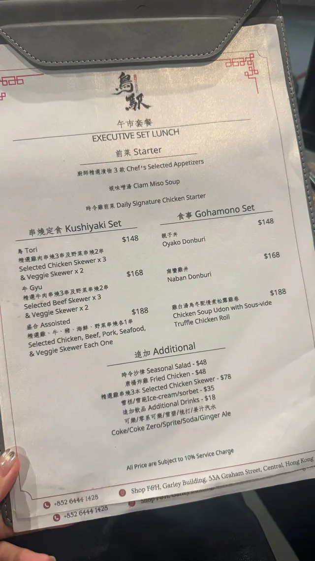 今晚同朋友经过中环新开嘅鸡串烧专门店!装修好特别同好靓,入面仲有sake bar!我地食咗鸟駅嘅「TORIEKI TASTING MENU」,完全感受到咩叫做「鸡の艺术」!由前菜到甜品一共10道菜,性价比超高,饱到捧住个肚走~🍶 前菜三重奏• 精选前菜/渍物:清爽开胃,腌制得恰到好处 • 慢煮松露鸡卷:鸡肉嫩滑到难以置信,松露香气扑鼻而来• 鸡肝茶碗蒸:蒸蛋滑溜,仲放咗足料鸡肝增添浓郁风味🔥 串烧盛宴 • 稀少部位三本:鸡心弹牙、鸡肝绵密、鸡软骨脆口,一次过试匀三个部位 • 严选部位三本:鸡脾肉多汁、鸡翼香脆,火候控制完美 • 野菜串烧:银杏回甘、豆腐外脆内嫩,平衡肉类油腻🍲 惊喜连场 • 三黄鸡白汤:浓郁到黏嘴唇!慢煮精华尽在其中 • 厨师长特别料理:烧鸭肝!!真心好好食,外焦内化,入口即溶,邪恶到极致 • 主食配置:鸡汤乌冬清甜解腻🍫 完美收官 榛子朱古力蛋糕配雪糕,浓郁朱古力与冰凉雪糕形成绝妙对比,为盛宴画上完美句号。…查看更多
