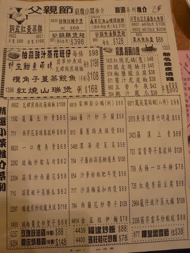 6月19日(星期日),是我倆婚後的首個父親節,也是破天荒首次兩家人一起「做節」的日子,因早前家母偶爾說過想和岳父岳母一起吃頓飯,難得岳父岳母亦不介意,順水推舟就促成是次「聯合做節」。因為坑口區適合一大夥人吃晚飯的地方大多試過了,亦為了方便岳父岳母,所以是次晚飯地點選擇在寶琳區。經過OR搜尋後,便決定選擇來這裡吃。大時大節一檯難求,所以我已一早在這兒訂位。當天六時左右分別出門,兩家人卻巧合地在港鐵站會合,然後一起步行數分鐘便到達此店。入座後檯上祇得父親節套餐的菜單,連忙著侍應遞上父親節特別版的點菜紙,看後選擇也不少,價錢亦頗合理,儘管侍應大力推介是日套餐,但在請示四大長老後,還是決定散點,當然點菜重任又是落在我倆身上。蟲草花淮山螺頭燉雞雖說是4-6人的份量,但分成8碗也剛好足夠。燉湯乃當日最出色的菜式,用料十足,湯頭色澤清澈,味道甘甜純和,藥材味道甚濃,而岳母更特地在湯渣中找出螺頭來吃,我們也吃了一小塊,肉質確實爽滑;瓦煎焗鮮河鉗魚腩:一打開瓦,羌蔥的香氣撲鼻而來,頗吸引;也許此菜是特惠孖竇其中之一,份量不多,似乎是將貨就價,每人吃了一塊魚件後就只剩下料頭了,再加“走油”後的鉗魚腩欠缺鮮味,有點失望;半隻銅盤蒸雞的雞件被切得頗修長,肉厚皮亦厚,因健康問題我們需去雞皮,結果可以入口的所餘無幾,幸好雞肉尚算軟滑;薑汁炒芥蘭是內子點的,菜炒得翠綠但有點硬,當我正想夾菜給家母,但岳母提醒家母要戒口而不可以吃芥蘭,只怪我這個當兒子的不夠細心;紅燒香菇豆腐是另一道家母不能吃的菜,尚幸這道菜有菜心伴碟,總算可以讓我有點青菜孝敬家母。軟豆腐經油炸及打茨味道不俗,但我就略嫌紅燒茨汁不夠濃稠;燒腩仔是家父的心頭好,未知此店的燒味是否自家出品,只見腩肉層次分明,肥瘦均勻,皮脆肉嫩,家父應該會喜歡;內子知道岳父岳母喜歡吃鴕鳥肉,所以點了豉椒炒鴕鳥肉。可惜鴕鳥肉完全被「師父」打鬆,肉味全無,真的不知道吃的是甚麼肉;內子事前已提醒我岳父岳母喜歡吃炒粉麵飯,結果點了一碟瑤柱桂花炒飯。但當我們十分期待下亦未見炒飯的蹤影,催了幾次單後才得知要儲齊「柯打」一次過炒,當我們把檯上所有食物幾乎吃光的時候,這個好像未炒好的炒飯終於來到了。除了炒得不夠乾身外,我們亦沒有發現任何桂花的蹤跡,未知廚房是否太忙忘了下配料?其實是晚菜式毀譽參半,有好有壞,此店既以「名廚」為店名,卻吃不出名廚功架,可能是我選擇錯了時候來,不應該在此等繁忙時節來,未能令四大長老吃出其真功夫,實在有點失望。查看更多