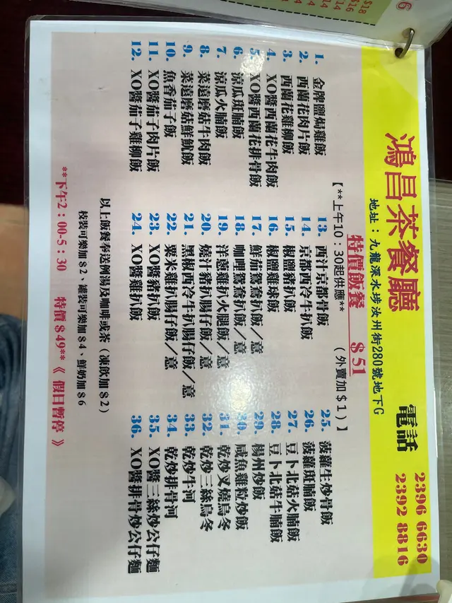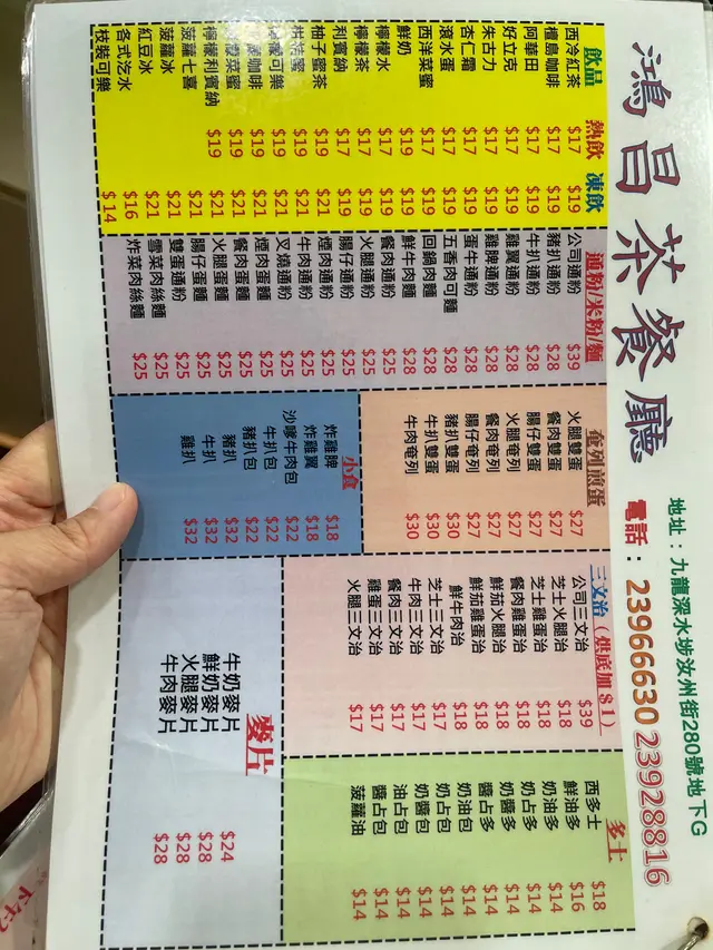 鴻昌茶餐廳 (深水埗) 网址: https://s.openrice.com/QrLS0ygs000 地址: 香港深水埗汝州街280號地下G號舖 电话: +852 23966630