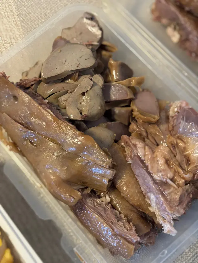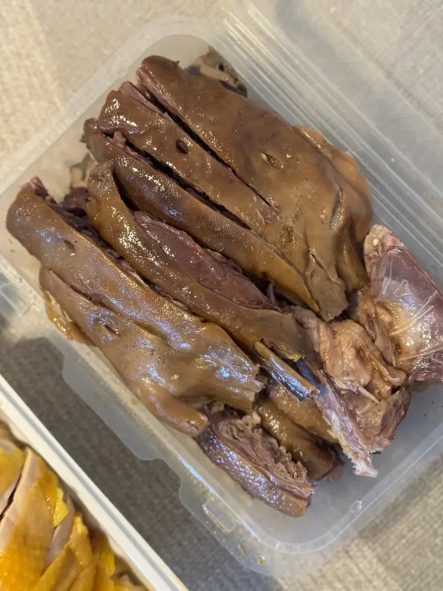 在外賣平臺購買,距離住家距離約十分鐘步行路程,備餐時間稍長但也無礙送遞員準時準點送達,包裝完好-點了一隻沙薑雞、一條鵝頭頸、一個鵝肝及兩個鵝腎,扣除優惠毋須$200-沙姜雞大隻肉白,皮爽肉滑,雞胸位也不會梅,略帶嚼勁,有雞的鮮香及淡淡沙姜味道,蘸上沙薑汁及薑蓉有提鮮之效-原條鵝頭頸份量十足,外皮微Q,肉嫩彈牙帶鮮鵝香;鵝肝粉嫩細緻,柔軟滑膩,甘香軟滑;鵝腎味道鮮美,爽嫩口感佳,整體來說餐廳選擇新鮮上乘,性價比不錯…查看更多