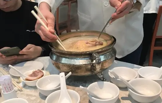 粗獷的鹿鳴春鹿鳴春裝潢維持90年代感覺. 餐牌印有有中,英,日語. 另有文宣特別介紹”鰣魚”, 市價為900幾一條, 身價不菲. 返家後google一下, 原來鰣魚係長江三鮮之首, 古時宮廷貢品, 但而家仲有無真正野生鰣魚架? 無緣食了~所有餸菜由家人發板. 先來一鼎砂鍋雲吞雞. 細size 5個人分, 每人都飲到3-4碗. 湯濃郁, 真材實料. 冷盤有2碟, 醬牛肉, 肉多筋少, 但鹵得軟嫩入味. 另外一碟係雲腿片, 味道近似金華火腿, 中國人parma ham. 一小片即可以伴一碗白飯, 但我覺得呢類食材比較適合做配角(用來炆花膠, 煮津白, 炒飯等), 淨食的話個人覺得鹹. 主菜當然係每枱必點的片皮鴨. 鹿鳴春走粗豪路線, 師傅刀工採厚切上碟, 不會有星級酒店細分淨皮、皮連肉和淨肉三種, 但不減風味. 包片皮鴨的春卷皮夠薄, 食多幾件都唔怕飽肚.最後來了糖醋里脊, 咕嚕肉淨肉版. 其實想加點高力豆沙, 但細碟都有10粒, 完全無可能食得曬, 為免浪費食物就放棄了.鹿鳴春大名聽得多, 就第一次食. 近年坊間評價下滑, 與全盛時期不可同日而言. 食完我覺得係大件夾抵食, 一d都唔差. 極度適合大伙人聚餐, 無限用餐時間, 環境熱鬧.查看更多