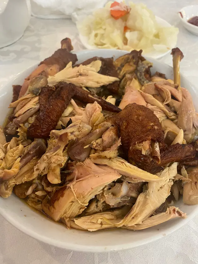 我想這一輩長大的,大概都沒有聽過山東燒雞。就是我這個老餅,也要從記憶很深處挖出來,就是舊「樂宮樓」在美麗華酒店舊翼的那個年代。記憶所及,那時的山東燒雞是用點心車推出樓面買的美點。時至今日,能夠吃到山東燒雞的,恐怕也只有「鹿鳴春」了。並且我留意到,它仍然保持只買中午,晚膳不做的菜色。未曾吃過的,或許值得提提它雖然是燒雞,卻是浸透在鹵水般的美味湯汁裏,十分滋味!這次我們也叫了叉子燒餅、榨菜肉末,和每人十隻水餃打底。其實也不是很多,伙計卻已投下了一點驚訝的眼神了⋯查看更多