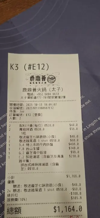 见到呢间火锅有做灵芝火锅, 认为比较几新颖, 于是入黎试下~老板声称自己系70岁,而且基本上一星期都食5日灵芝左右无论打边炉/煲汤,都会落灵芝粉所以今次我哋打边炉都唔例外,要试吓佢地招牌灵芝火锅🍲!先黎一杯🥃cocktail茅台酒加入左少少灵芝, 喝下去无咁伤身 / 宿醉而且有微微的荔枝、玫瑰味, 所以喝下去很清甜, 非常易入口~再送一份餐前小食: 灵芝七味脆脆小食,表面放上灵芝粉,再带微微辣味,尤其开胃另外再order左一壶灵芝茶:有沉香,更有减肥功效,喝下去苦而不涩~鹿鼎五色海鲜·灵芝养生锅套餐招牌灵芝四季清润椰子汤底店员建议可以饮汤先,尤其清甜,之后再放海鲜入去烹调~蛏子皇(涮煮20-25秒)可以不用蘸任何酱汁,吃下去非常弹牙,尤其新鲜~台山蚝(涮煮4-5分钟)涨卜卜超级肥美,鲜味十足,而且不会有任何腥臭味~鲜鲍鱼(涮煮20-25秒)鲍鱼切成一片片,煮一阵仔就可以享用,口感无庸置疑系好弹牙啦~大花甲(涮煮20-25秒)无任何沙粒,吃下去好淡淡肉好新鲜,餐厅选择的海鲜食材绝对系高要求~吃到一半,店员会中途放灵芝粉,会减少「嘌呤」店员亦送了2包灵芝粉,无论之后熬汤/在家打边炉,都可以放入去一齐煮架~手工韭菜饺子🥟好丰富的韭菜馅料,饺子皮亦唔会太厚,放入口size刚刚好~手工鲜丸 (云吞,虾丸,墨鱼丸)云吞馅料都好丰富,有原粒虾 & 猪肉,皮薄馅靓~虾丸 & 墨鱼丸绝对手打制造,口感弹牙灵芝蟹籽墨鱼滑墨鱼滑弹牙,配上粒粒蟹籽一起吃,有粒粒涨爆口感~而且配上灵芝,感觉无咁肥腻~田园蔬菜前面食咁丰富,当然要食返D蔬菜中和一下口腔肥腻感~个人比较推荐食淮山,真系好清甜~日本芋丝份量非常充足! 口感爽脆~蓝莓🫐芝士奶冻 配 灵芝酱酒餐厅奉送的甜品,放上酱酒一起吃,一开始会以为好难入口,酒精太浓烈估唔到配上奶冻一起吃,可以balance返~而且好match!!…查看更多