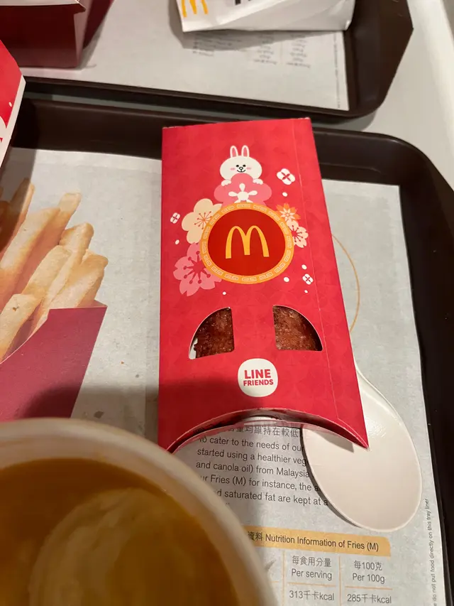 一年得一段時間有得食,梗係要食多幾次,今次順便試埋紅豆🫘吉士批同龍蝦🦞湯今次呢間既招財牛堡熱好多,汁濃好多,雖然薯餅都係唔脆既,但整體就好食左龍蝦🦞湯真係有龍蝦肉係裏面,雖然細隻啲,但都幾彈牙幾有龍蝦味,飲落去都唔會話苦,飲落去幾順幾滑,係鹹左少少,但都唔錯紅豆🫘吉士批,外殼係粉紅色既,可能配合新年,但就冇特別味道裏面就係一半紅豆一半吉士,吉士味唔係好重,食落去好似普通紅豆批咁樣,但係因為紅豆🫘好食,個批好脆好熱好食,所以成個批都幾好,最鍾意食個批嘅外殼,但唔鍾意食蘋果批,每次一出紅豆🫘係咁食再一次證實麥當勞每間分店都係唔同質素,食到好唔好食真係撞手神查看更多
