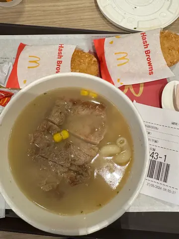 今日又去到麦当劳食早餐,通常习惯都叫两块薯饼,一间麦当劳既炸薯饼有少少失色,有少少唔够热,令到成块薯饼有少少黐住张纸,不过通粉就够热,鸡扒非常好食,再加埋本身猪骨汤同埋汤底下便嘅粟米,整体上都几配合,呢一个价钱冇乜可以complain, 合格好食程度(5粒🌟)🌟🌟🌟🌟抵食程度(5粒🌟)🌟🌟🌟🌟位置 (5粒🌟)🌟🌟🌟服务态度 (5粒🌟)🌟🌟🌟🌟衞生程度 (5粒🌟)🌟🌟🌟🌟…查看更多