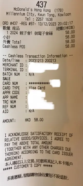 Visa, Master, AlipayHK, 支付宝, 现金, 八达通, 美国运通, 银联, JCB, Apple Pay, Google Pay, BoC Pay, 微信支付, 云闪付, PayMe