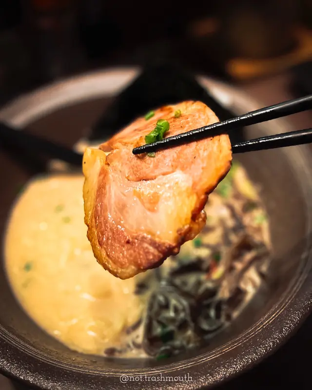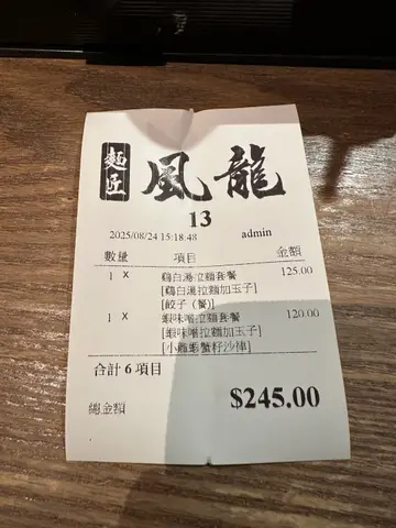 餐厅:面匠风龙地点:湾仔轩尼诗道菜式:拉面餐牌:3款拉面、两款小食、饮品,都有套餐虾味噌拉面套餐 $120虾味噌拉面汤底呈橙色,饮啖汤先,质感厚身,而味道真系好浓虾味,但系完全唔油,好正!面头仲加有樱花虾仔,配料有一只半熟玉子,葱花,一片紫菜同粟米粒,口感丰富。面条系超级幼身,味道唔错。半熟玉子真系流心,味道唔会太浓。两片叉烧另上,面头加上葱花,肉质半肥瘦,烧得好香,猪味浓,唔会太硬。个汁唔错。枱面特别提示要快食。浓厚胡椒鸡白汤拉面套餐 $125浓厚胡椒鸡白汤拉面个汤底绝对系奶白色,饮落鸡味浓,口感厚身,完全唔油腻。鸡胸有四片,嫩到入口即化咁滞,完全唔肥,健康又好味。其他配料半熟玉子一只,好多爽脆黑木耳,葱花同藏红花,面头加上适量胡椒调味,令味道更出色。小龙虾蟹籽沙律小龙虾蟹籽沙律有6片正方形紫菜围边,中间一球小龙虾蟹籽沙律球,面头加有樱花虾仔。沙律球冰凉而口感脆脆地,味道咸香,配脆身紫菜口感好正。饺子饺子一客四只,呢度饺子皮超级报而带少少烟韧,入面有韭菜同肉,味道唔错,口感一级棒。配醋食更好味。枱面有辣芽菜,白芝麻,蒜蓉等调味料。饮品除左冰水仲有冰麦茶,好解渴。今餐拉面汤底真系非常出色,而饺子都系令人惊艳。入面座位都好阔落,坐得舒服,比一般拉面店好好多。…查看更多