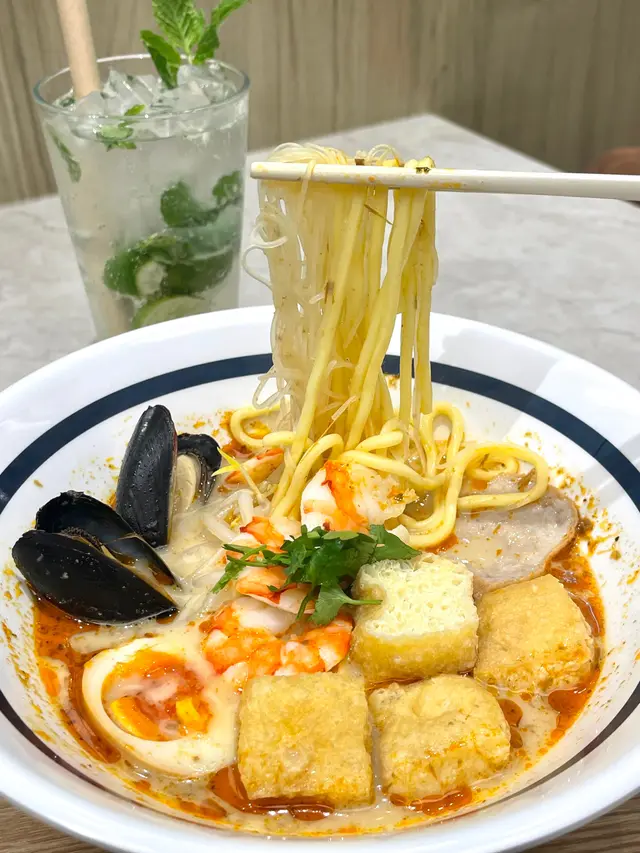 麵堂是一間位於啟德體育園啟德零售館的星馬泰主題麵店,餐廳裝修簡潔,燈光明亮。主打東南亞特色湯麵同手作拌麵。馬來喇沙湯虎蝦流心蛋摻摻:湯底帶有微辣,椰香味十足,辣度適中非常順口。配料豐富包括新鮮虎蝦、青口、豆卜、爽脆芽菜和軟滑的流心蛋,蛋黃帶有濃郁醬油味,豆卜吸湯,整體味道層次豐富。清雞湯香茅豬扒鮮河粉:豬扒煎至外層微焦帶脆,肉質鬆化有肉汁香茅香氣濃郁且滲透豬肉之中,鹹香惹味。清雞湯底清甜,河粉滑嫩。白咖啀香茅豬扒飯:豬扒外脆內嫩,肉汁飽滿,香茅味道明顯,為豬扒增添獨特香氣,白咖喱汁帶有椰漿的淡淡甜香及微辣,香料豐富。青檸鮮薄荷梳打:青檸味道酸中帶甜,新鮮薄荷葉帶來涼爽清涼感,梳打水的氣泡使飲品有刺激感,更添解渴。鳳梨清新特調味道帶有酸甜、清爽且果香濃郁,加入氣泡梳打,帶來清新且不會太甜膩的口感。炸雞脾即叫即炸,外皮金黃香脆,內裡雞肉juicy。娘惹大蝦:蝦肉鮮嫩且帶有甜味,配芽菜蝦增加口感層次。脆炸豆腐配魚露配酸汁:豆腐外皮炸得非常脆,內裡柔軟。搭配酸汁,增添鮮味兼開胃。…查看更多