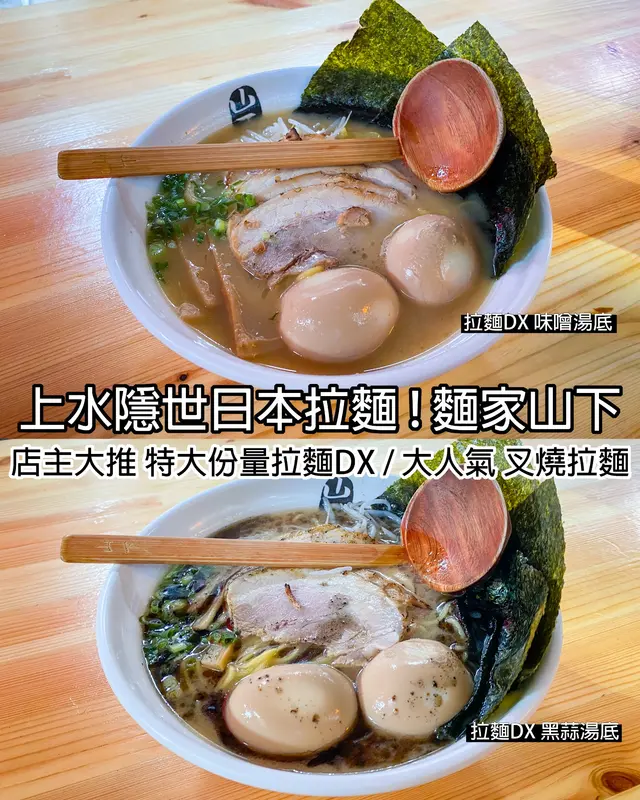 麵家山下係一間隱世小店不知不覺係上水小街已經十週年🍜拉麵DX 食拉麵一定要有叉燒同蛋,所以直接叫DX如果鍾意多叉燒唔要蛋,可以叫叉燒拉麵拉麵DX真係特大份量,蛋都有兩隻叉燒 少少薄,但有4大塊燒得好好,肥瘦適中,腩肉好淋麵質好爽口彈牙👅味道:❤️❤️❤️❤️🍔賣相:❤️❤️❤️🏝環境:❤️❤️❤️🤵🏻服務:❤️❤️❤️❤️📸打卡:❤️❤️💵價比:❤️❤️❤️❤️💌雖然係小店,但餐廳係日本人主理所以口感都似真正日本拉麵🏠 麵家山下上水新康街63號地下D3-D4號舖🕰營業時間:星期一至日 1200-1530 & 1800-2000 🔖拉麵•日式🚇交通: 港鐵上水站 A4 出口, 步行約7分鐘☎️電話:64827340查看更多