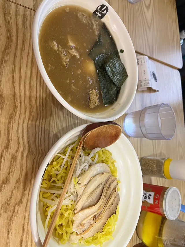 一向都好欣賞麵家山下嘅拉麵,因為個湯底同埋要質都非常好食雖然呢度環境唔算好好,不過食物質素可以搵到到一切今日心血來潮想食沾麵,Order嘅時候,店員話係最後一份,估唔到一送到上嚟,份量非常之足不過沾麵的湯底就比較稀,湯汁好難掛住個麵,味道亦都有少少淡,所以有少少失望但係其他配料好似糖心蛋、叉燒冇得輸,叉燒淋滑爽口,切到好薄片,可以拌好多汁嚟一齊食,糖心蛋亦都係,入味又留心試完沾麵之後,我決定下次都係會食返拉麵🍜我覺得係最適合我😁查看更多