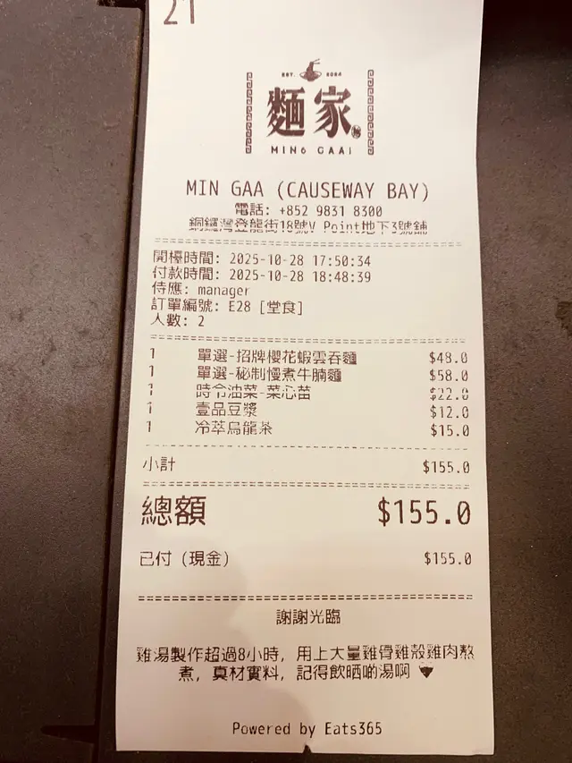 📍Shop 3, G/F, V Point, 18 Tang Lung Street, Causeway Bay銅鑼灣登龍街18號V Point地下3號舖---Step into this cozy noodle haven and you’ll be greeted with the aroma of slow-cooked broths and freshly wrapped wontons. Min Gaa’s dedication to traditional Hong Kong-style noodle craft shines through every dish.🍽️ Highlights:• 🦐 Signature Sakura Shrimp Wonton Noodles 招牌櫻花蝦雲吞河粉A must-try! Juicy handmade wontons infused with sakura shrimp aroma, paired with silky rice noodles and a rich, MSG-free chicken broth simmered for 8 hours.• 🐮 Beef Brisket Noodles 秘製慢煮牛腩河粉Tender, slow-braised brisket with balanced fat and lean cuts, served in a comforting broth. The beef melts in your mouth while the noodles soak up all the savory goodness.• 🥬 Seasonal Cooked Vegetables 時令油菜Fresh greens served with your choice of oyster sauce or beef jus. A light and refreshing complement to the rich noodle dishes.• 🥛 Soy Milk 壹品豆漿Smooth and nutty, this house-made soy milk is a perfect non-caffeinated pairing with your meal.• 🍵 Cold Brew Oolong Tea 冷萃烏龍茶Fragrant and chilled, this tea offers a refreshing finish with floral notes and a clean.---✨ Summary:🍜 Noodles: Silky & satisfying🦐 Wontons: Juicy & aromatic🐮 Brisket: Tender & flavorful🥬 Veggies: Fresh & light🥛 Soy Milk: Smooth & creamy🍵 Oolong Tea: Cool & fragrantMin Gaa 麵家 is a celebration of Hong Kong noodle culture—simple, soulful, and expertly crafted. Whether you’re craving comfort or exploring new flavors, this spot deserves a place on your must-eat list!…查看更多