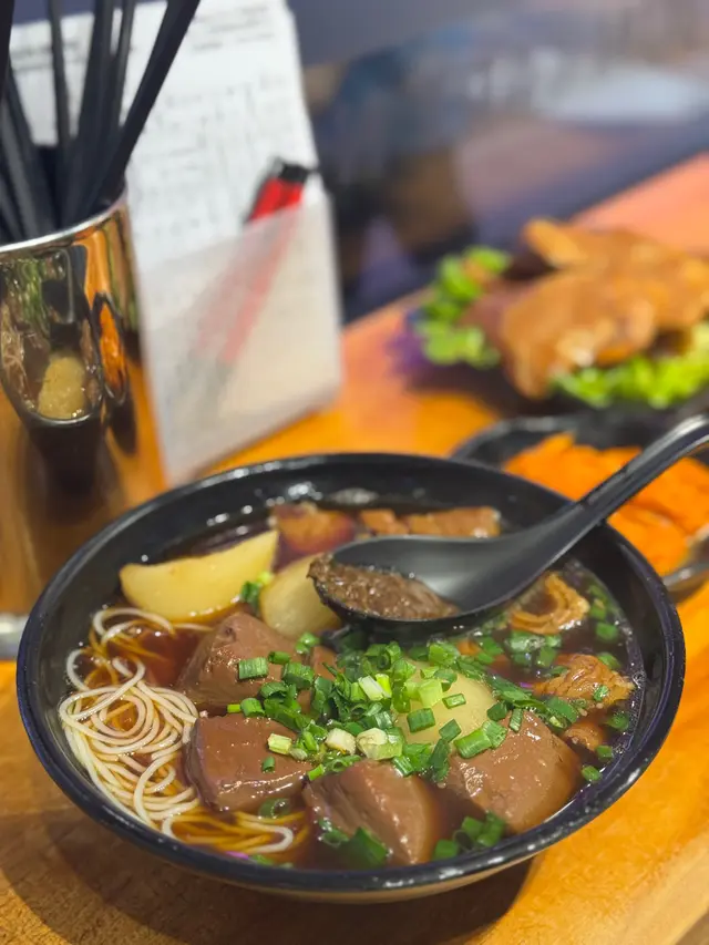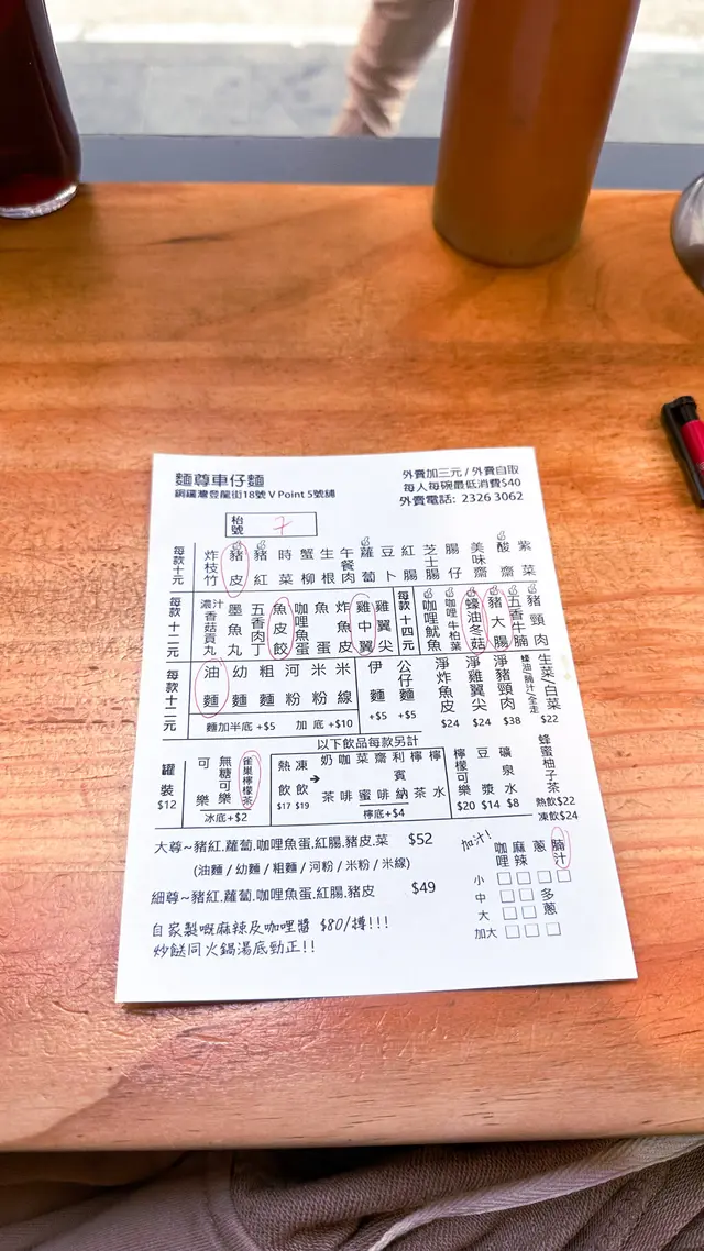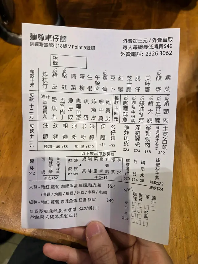 銅鑼灣約了朋友續約健身,登龍街打算揾啲平淡啲晚餐。見到人龍排隊,原來有間車仔面,試過銅鑼灣榮記,未試過呢間。於是我也跟人排隊。等了差不多十分鐘,陸續有人出好快就輪到我哋。店內的裝潢別有風味,應該話成個登龍街的店面都是如此,有特色加店鋪個性。傳統的點單紙。不過好似被我們畫到花曬。叫車仔麵,普通好似我咁的食家會選擇幼麵,幼麵的口感特點細滑軟彈比粗麵更細(類似廣東的 銀絲細麵),質地偏軟但帶微微彈性,容易吸附湯汁,適合喜歡入味的食客。口感順滑不黏糊,湯汁分離。因為麵條細,能緊密裹住湯底(如咖哩汁、腩汁),每一口都充滿濃郁風味,尤其適合搭配*美味濃郁湯底!幼麵+咖哩汁*幼麵能平衡咖哩的濃稠感。朋友的餸是粗麵。不過因為飲品需要另外加錢,就算咁埋單每個人都不超過200,性價比在銅鑼灣超值。而我的小食裏面,選用了酸甜的酸齋, 外層微韌,內裡蓬鬆吸汁,咬下去帶有微微彈性,因浸泡過醃汁,整體偏軟但不會爛糊,似是齋鋪裏面的小吃點心,搭配幼麵口感,爽滑又解膩。食得一半,抬頭發覺周圍坐滿,而且都系搭臺多,座位相對對於搭臺系少少擠逼,因為食飯時間。翻檯率都好高,匆匆忙忙食完就有下一批。🤣好似我等十分鐘就立即有位咁,真系唔怕排。…查看更多